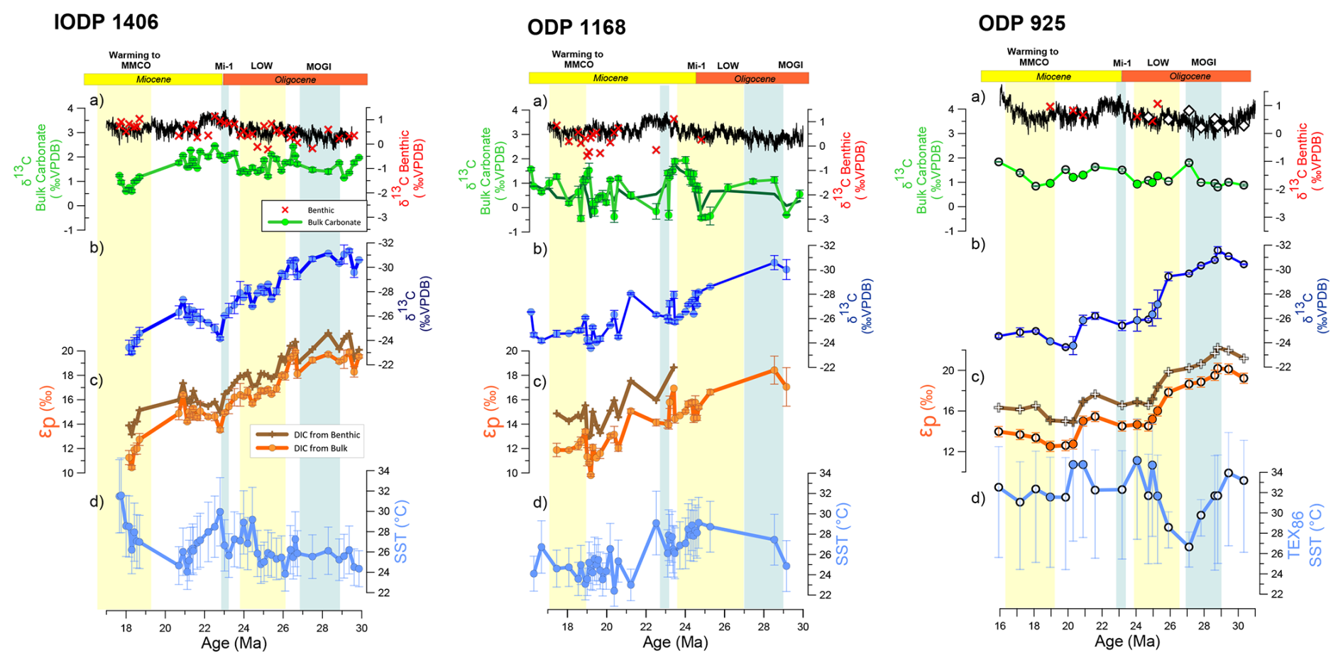 One approach to evaluate the relative contribution of physiological factors vs CO2 is to produce εp records from sites of widely contrasting oceanographic setting, where the CO2 signal may be expected to be common to both locations but the environmental factors affecting the fractionation such as nutrient availability might not be expected to change in unison. In this study, we produce a new long-term record of εp over the Oligocene to Miocene time interval at two new, widely separated locations: IODP Site1406 in the subtropical North Atlantic off the Newfoundland coast, and ODP 1168 in the Southern Ocean off Tasmania. We also increase the resolution of determinations at the equatorial Atlantic ODP 925. The existing εp-based CO2 estimations for the Oligocene are derived from ∼ 1 million year resolution measurements from two sites (Site 925 and 516) on the South American margin of the equatorial and South Atlantic; in the early Miocene an additional North Atlantic record (Site 608) provides data (CenCO2PIP Consortium, 2023).