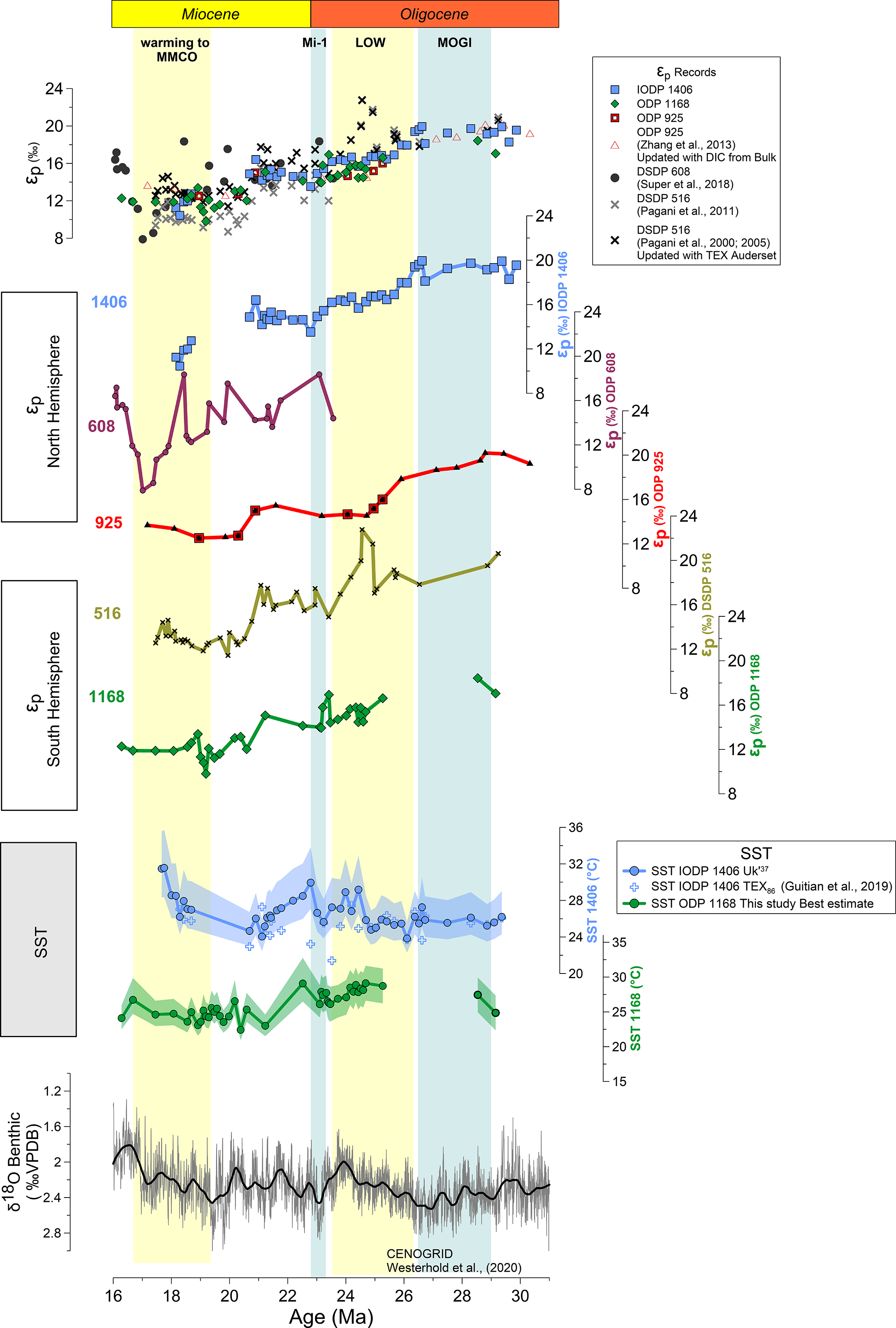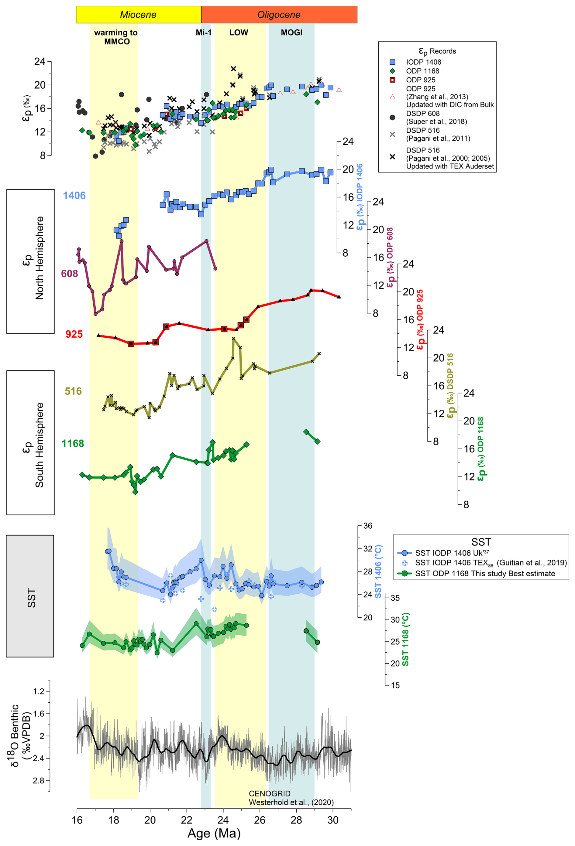 To compare our new records with previous data spanning the same time interval, we discuss published εp datasets recently compiled by the paleo CO2 community (CenCO2PIP Consortium, 2023), from DSDP 516 in the South Atlantic (Pagani et al., 2000, 2005, 2011), DSDP 608 in the North Atlantic (Super et al., 2018), and the equatorial site from ODP 925 (Zhang et al., 2013). For these, we ensure that εp for the published records is calculated from biomarker-based paleothermometers. The most recent publications from DSDP 608 and 925 used glycerol dialkyl glycerol tetraethers (GDGT) derived estimations from TEX86. To better compare our results with DSDP 516, where originally temperatures were derived from δ18O of planktic foraminifera for the Miocene section and GDGTs for part of the Oligocene, we have updated the εp calculations using a running averaging of the recent higher resolution GDGT temperature reconstructions from Auderset et al. (2022) at the same site.