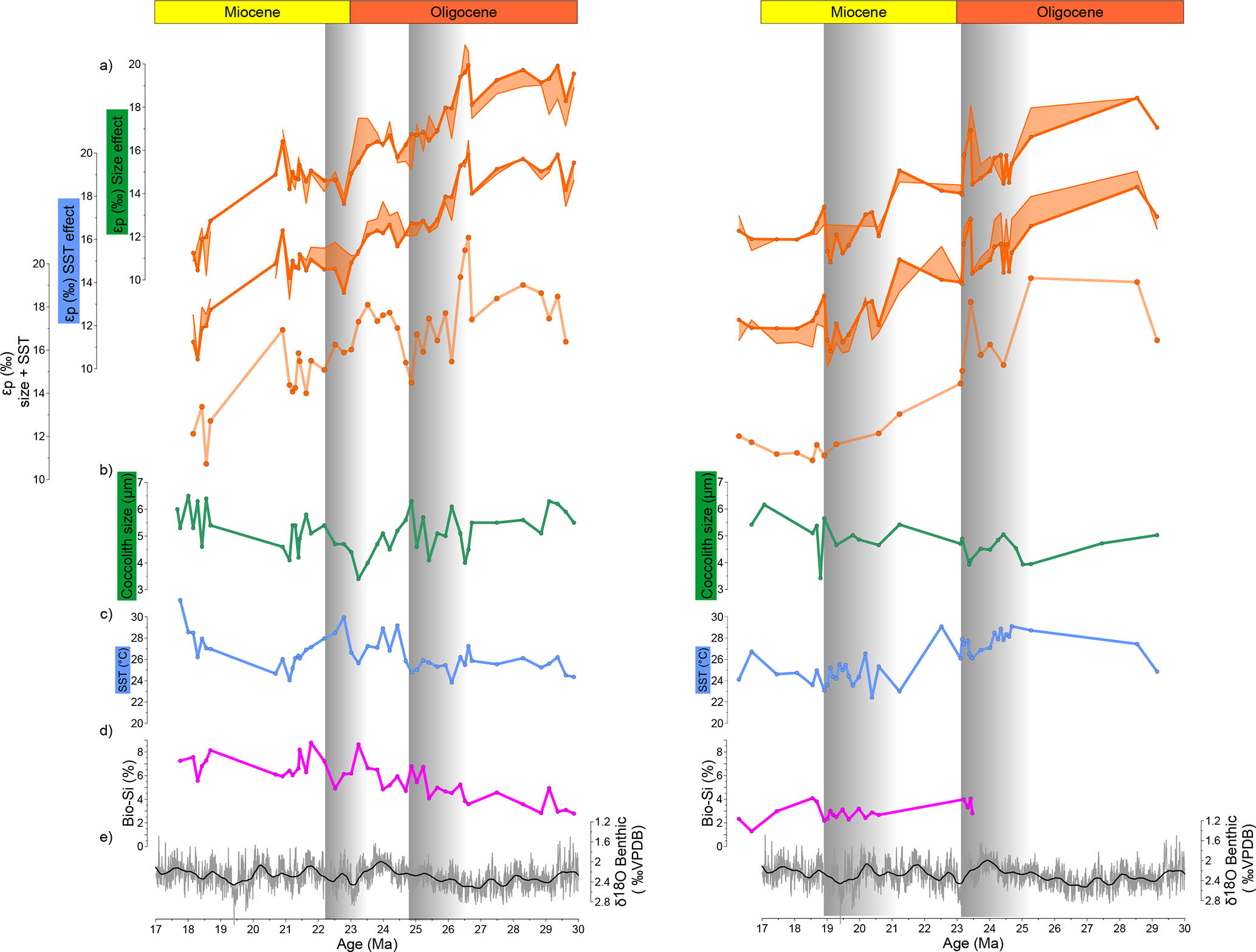 The overall decline in εp through the time interval of our records, is broadly comparable to the trend in published εp datasets recently compiled by the paleo CO2 community (CenCO2PIP Consortium, 2023), which exhibits a long term decrease in the late Oligocene through the transition to the Miocene and to overall low and stable values in the early Miocene (Fig. 4). However, several factors complicate a detailed comparison of our new and the previously published records.