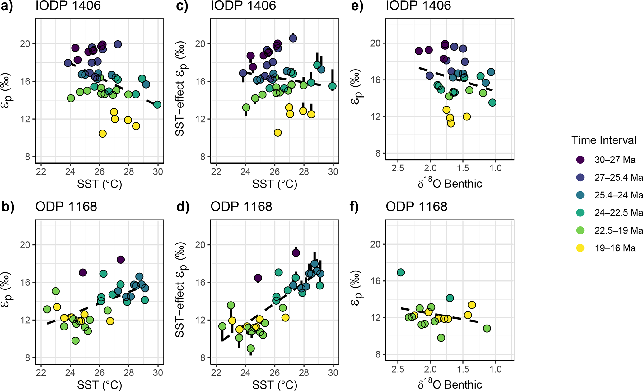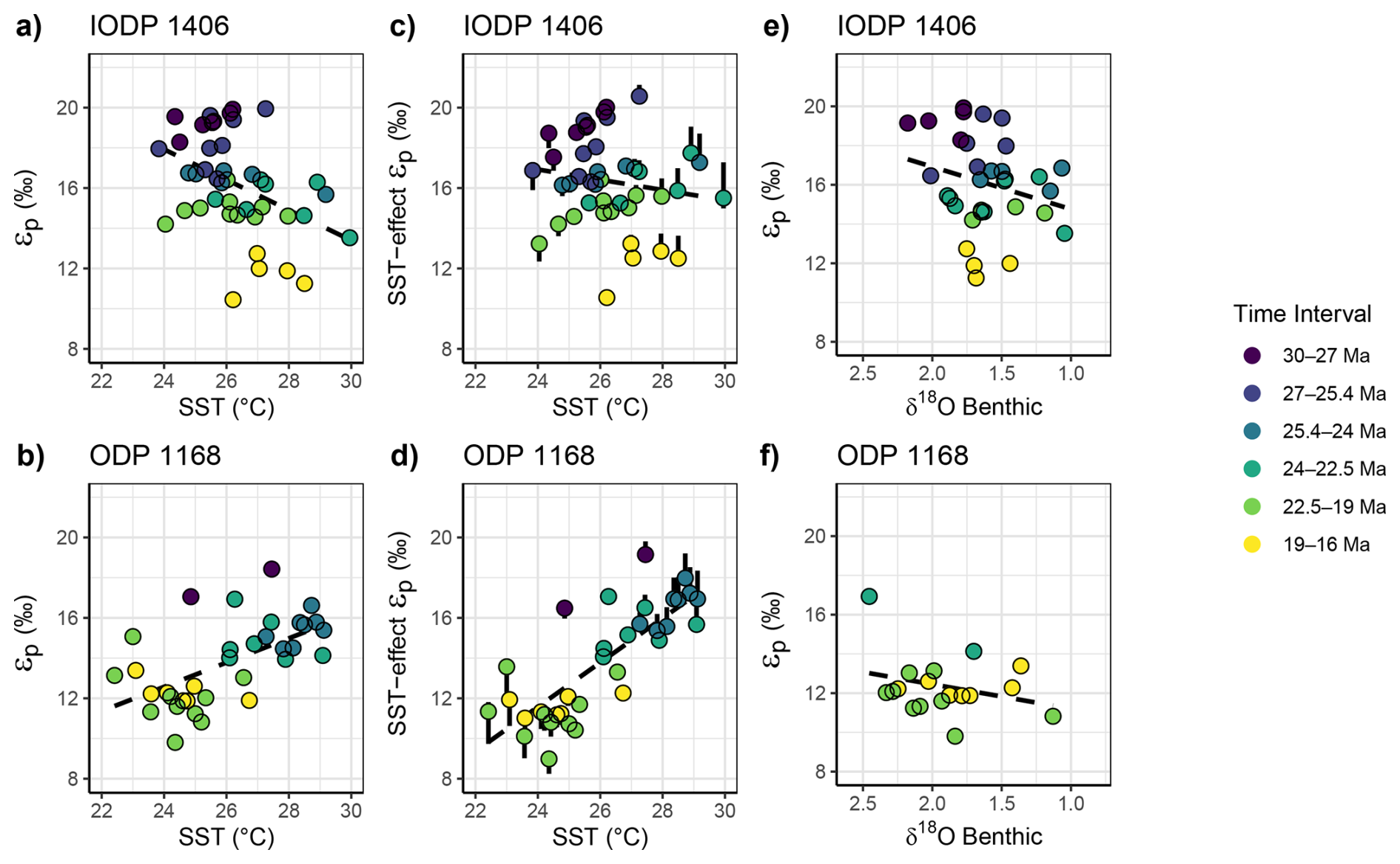 Figure 6(a–b) For paired samples, relationships between the measured εp and SST for Site 1406 and 1168. (c–d) Relationship between SST and εp, when the temperature-dependent growth rate effect on εp has been removed using the observed dependence of from culture experiments of 0.5 ‰ (0.37 ‰–0.95 ‰ range indicated by error bars) decrease in εp per 1 °C warming (Torres Romero et al., 2024). (e–f) For paired samples, measured εp and benthic δ18O. Dashed dark line in the plot background shows the regression for the overall dataset. See Fig. S3 and Table S3 for overall statistical relationships.