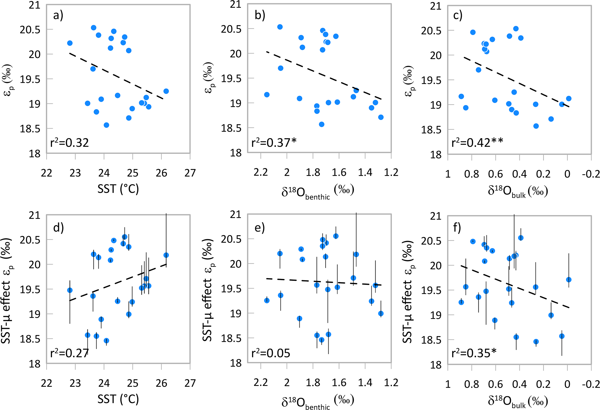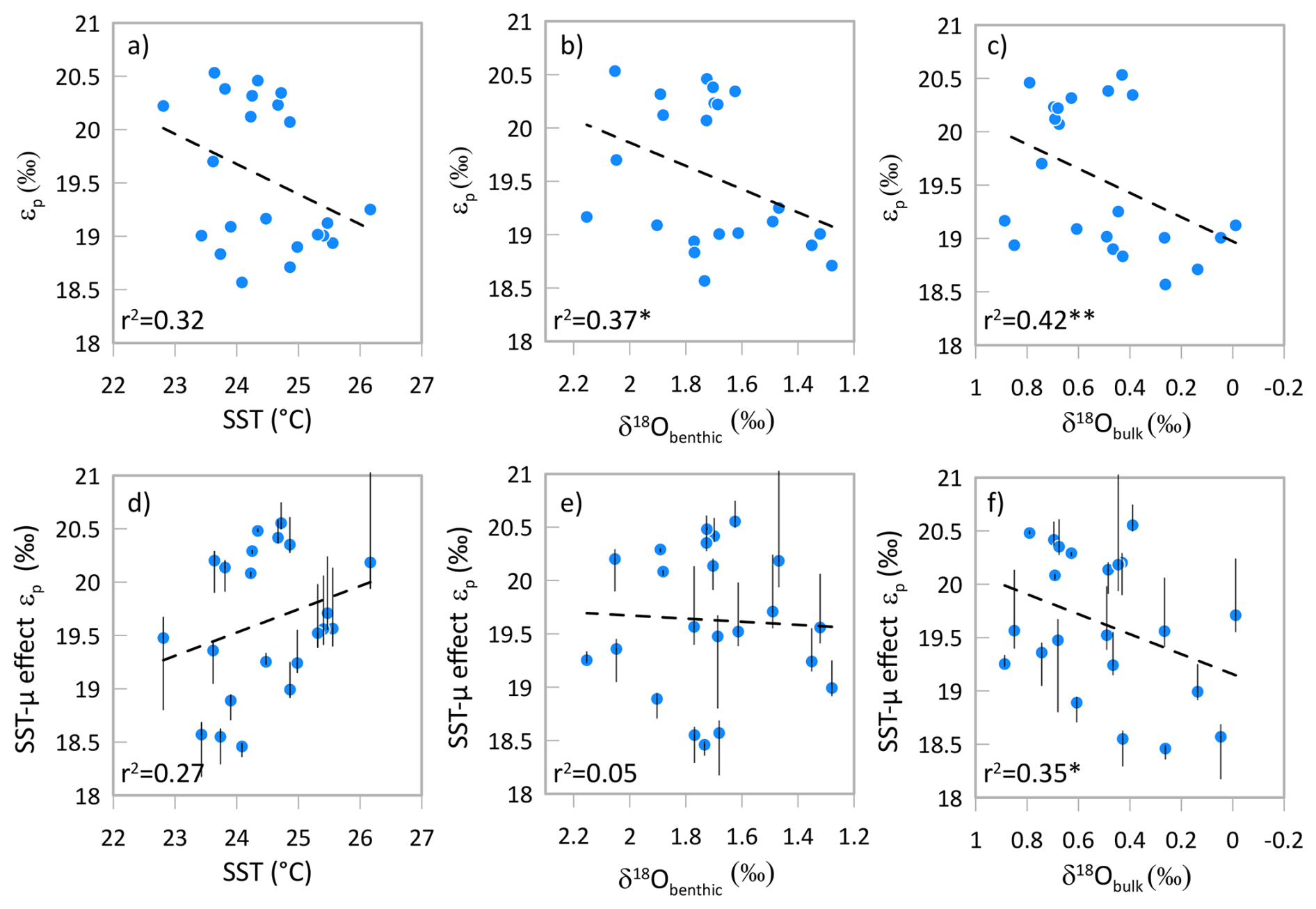 Figure 7For the high resolution 29 to 29.6 Ma interval at Site 1406, relationship between calculated εp and temperature, δ18O from benthic foraminifera, and δ18O from bulk carbonates. Panels (a) through (c) illustrate the measured εp. In panels (d), (e) and (f) εp is corrected for temperature-driven growth rate variation, using the temperature effect on εp following findings from cultures of 0.5 ‰ per 1 °C (Torres Romero et al., 2024). Vertical error bars illustrate εp values when the slope of the correction ranges from 0.37 to 0.95 ‰ per 1 °C warming. Dashed line shows the linear regression for all plotted samples. * p value < 0.1, p value < 0.05.