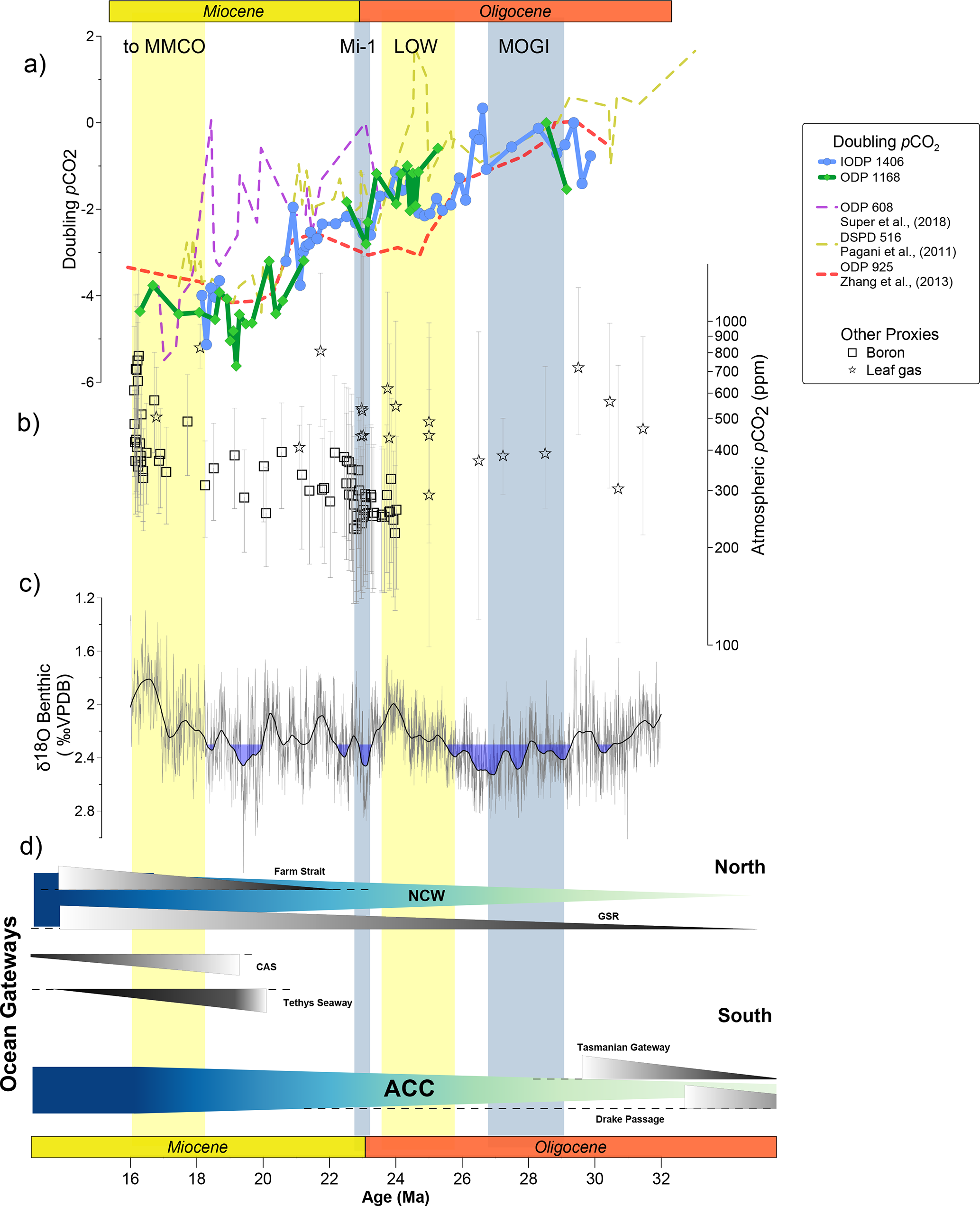 Figure 8Implications of CO2 as main climate driver. (a) pCO2 doubling for the discussed sites from εp referenced at 29 Ma (Site 608 referenced to maximum at 23 Ma). Solid lines are calculated using the SST corrected εp (b) pCO2 estimates from boron and leaf gas compiled in CenCO2PIP Consortium, (2023) (Sosdian et al., 2018; Greenop et al., 2019; Liang et al., 2022b; Londoño et al., 2018; Liang et al., 2022a; Tesfamichael et al., 2017; Reichgelt et al., 2020; Moraweck et al., 2019; Roth-Nebelsick et al., 2014; Sun et al., 2017; Erdei et al., 2012). (c) Benthic δ18O global compilation (Westerhold et al., 2020). (d) Schematic representation of main paleoceanographic and paleogeographic changes over the studied time interval for the Northern and Southern Hemisphere. ACC arrow refers to a shallow circulation not synonymous with the deep late Miocene ACC described by Evangelinos et al. (2024). Yellow and blue vertical bands show main warming and cold periods as Middle Miocene Climatic Optimum (MMCO), Mi-1 glaciation, Late Oligocene Warming (LOW) and Middle Oligocene Glacial Interval (MOGI). Antarctic Circumpolar Current. NCW: Northern Component Water.