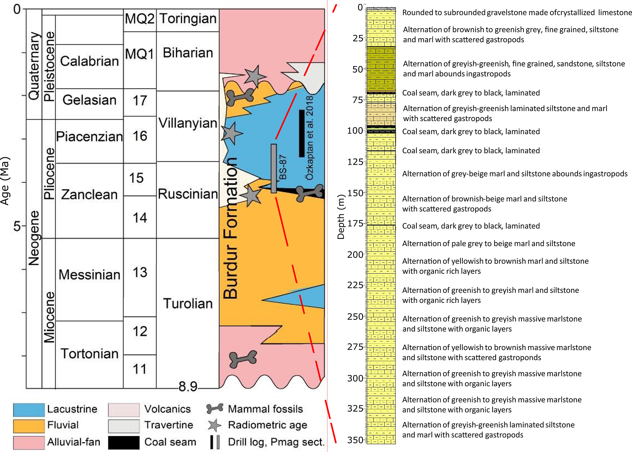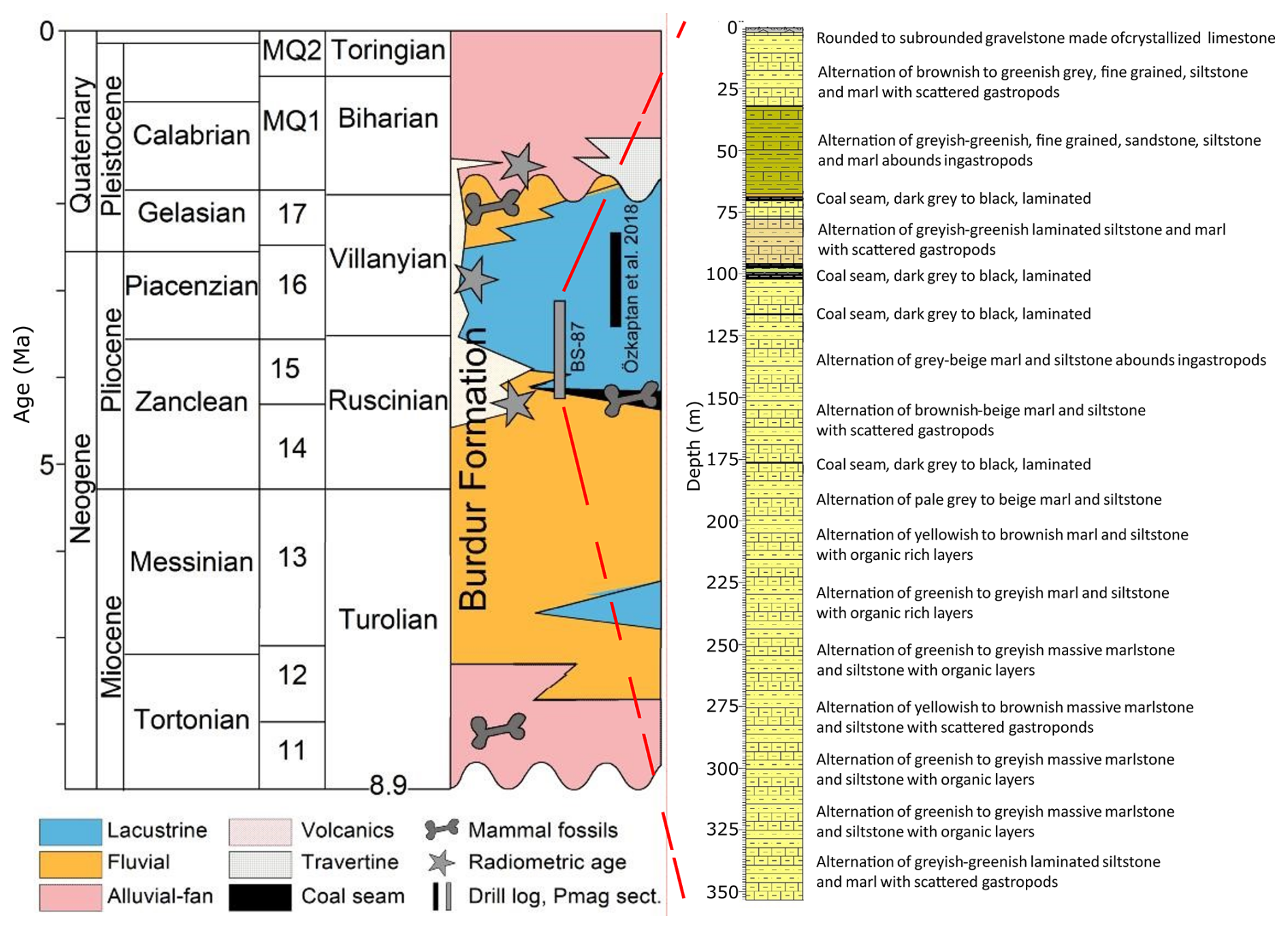Figure 2The studied drill-log of BS-87 within the stratigraphy for the Burdur basin-fill succession (Sickenberg and Tobien, 1971; Lefevre et al., 1983; Karaman, 1986; Price and Scott, 1991; Saraç, 2003; Platevoet et al., 2008; Alçiçek et al., 2013a, b; Demirel and Mayda, 2014; Alçiçek et al., 2017; Özkaptan et al., 2018a; Alçiçek et al., 2019). The chronostratigraphic units stand on Hilgen et al. (2012).