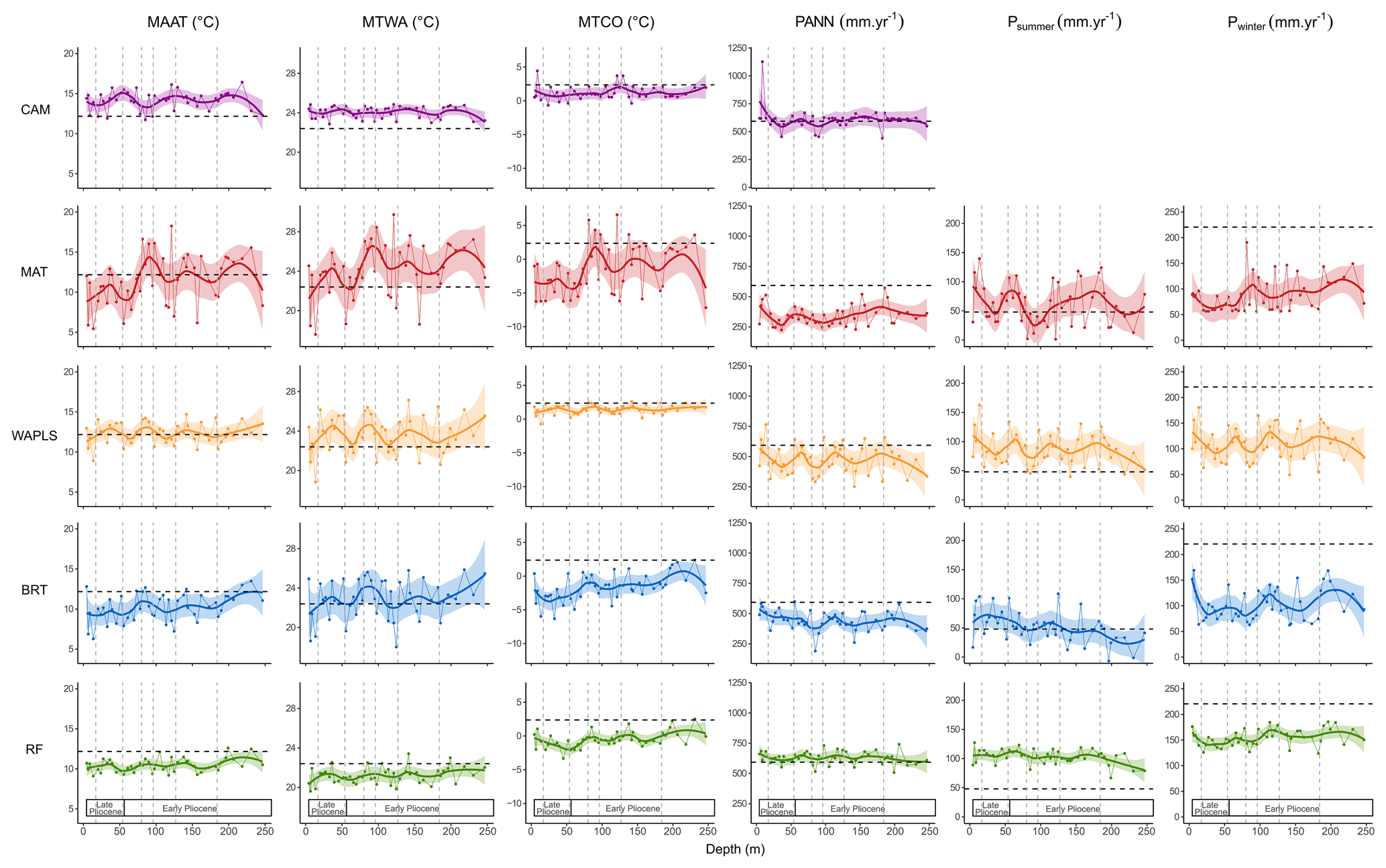 Traditionally, “Coexistence Approach” methods have been preferred for periods predating the Quaternary because they enable the quantification of climatic conditions during intervals (such as the Pliocene) for which no modern analogs exist in contemporary pollen floras. Among these methods, the Climatic Amplitude Method (CAM), developed by Fauquette et al. (1998a), has proven particularly effective for reconstructing Neogene climate conditions (e.g. Fauquette et al., 1999, 2006; Jiménez-Moreno and Suc, 2007; Jiménez-Moreno et al., 2008). In the present study, CAM has been applied to the Lake Burdur pollen assemblages alongside other methods more commonly used for Quaternary datasets, including the Modern Analog Technique (MAT; Guiot, 1990) and the Weighted Averaging Partial Least Squares regression (WA-PLS; ter Braak and Juggins, 1993) (see also Peyron et al., 1998; Robles et al., 2023; d'Oliveira et al., 2023; Sassoon et al., 2025).