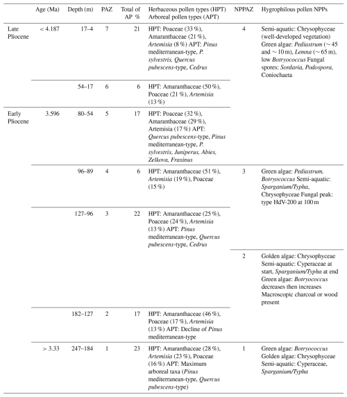PAZ 2 (184–127 m) shows a dominance of Amaranthaceae (ca. 46 %), a decrease of Artemisia (ca. 13 %), whereas Poaceae remain constant (ca. 17 %). Arboreal pollen taxa also decrease slightly (17 %), notably due to the decline of Pinus mediterranean-type. Rare pollen types include: Asteroideae, Cichorioideae, Cerealia-type, Pinus sylvestris-type, Ephedra distachya-type, Cedrus, and Abies.