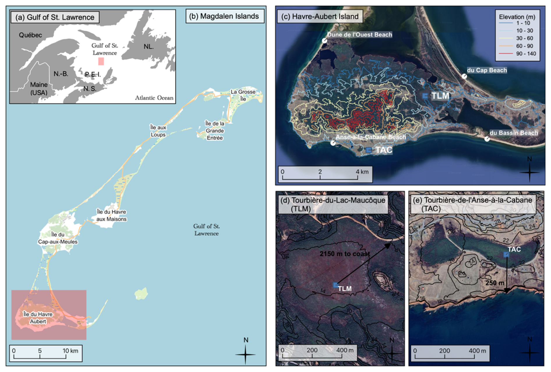 We studied two peatbogs, Tourbière-du-Lac-Maucôque (TLM) (47°14′30.9′′ N, 61°55′24.7′′ W, ∼ 14 m a.s.l.) and Tourbière-de-l`Anse-à-la-Cabane (TAC) (47°12′54.0′′ N, 61°57′48.4′′ W, ∼ 20 m a.s.l.), located on Havre-Aubert Island, the southernmost island of the Magdalen Islands archipelago (Fig. 1a–c). TLM, a circular peatland with an area of 40.2 ha and an elevation 14 m a.m.s.l., is situated approximately 2 km from coastal beaches on the south and northeast side of Havre-Aubert Island (Fig. 1d) (Ministère de l'Environnement, de la Lutte contre les changements climatiques, de la Faune et des Parcs, 2021b). TAC lies parallel to the coast, covers 9.0 ha, has an elevation 20–22 m above mean sea level, and has its centre 250 m from the nearest south-facing red sandstone cliffs (Fig. 1d) (Ministère de l'Environnement, de la Lutte contre les changements climatiques, de la Faune et des Parcs, 2021a). Both sites are designated as protected areas by the Gouvernement du Québec due to their endangered populations of northern dwarf huckleberry (Gaylussacia bigeloviana [Fernald] Sorrie and Weakley), a small coastal shrub present at both locations. The dominant vegetation in the peatlands is Sphagnum spp. moss (Lindb.) and shrubs from the Ericaceae family, with black spruce (Picea mariana [Mill.] Britton, Sterns & Poggenburg) growing around the perimeter.