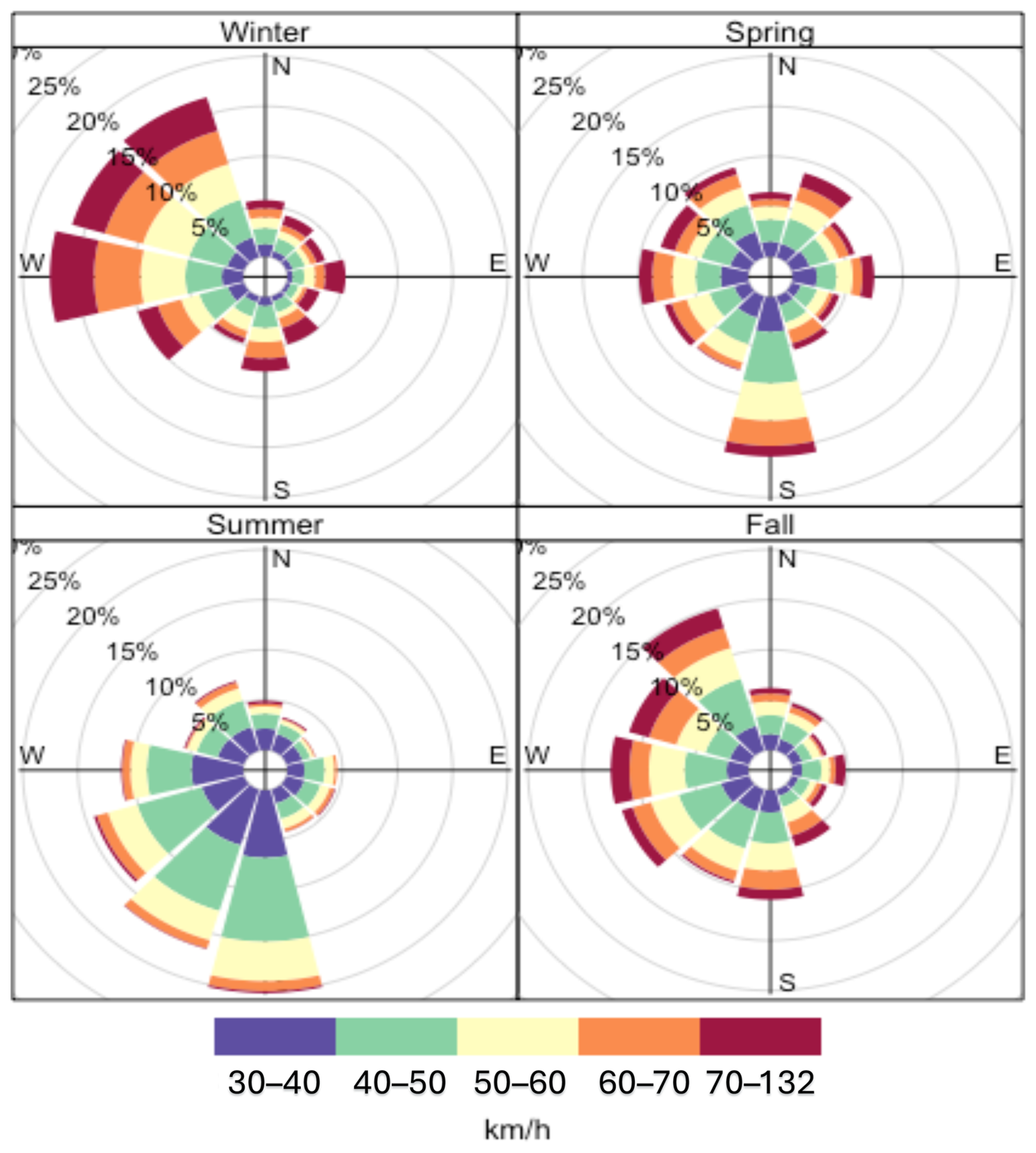 Prevailing winds in the Gulf of St. Lawrence and around the Magdalen Islands are predominantly westerlies, with a distinct seasonality. Winds are primarily from the south southwest in spring and summer (40–50 km h−1 for 15 % of the time), and from the northwest in the fall and winter, which are occasionally much stronger (70–132 km h−1 for 15 % of the time) (Fig. A1). These westerlies contribute to more pronounced coastal erosion and narrower beaches on the islands' western shores (narrower beaches), while the eastern coasts remain relatively sediment-rich (Morin, 2001; Forbes et al., 2004).