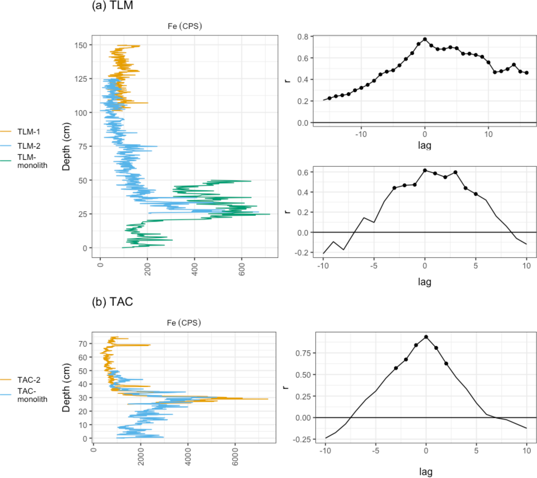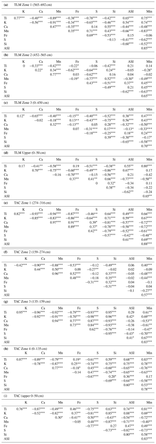 Core zonation of TLM and TAC was determined using stratigraphically constrained cluster analysis (CONISS) from the rioja package version 1.0-7 in R (Juggins, 2024) on LOI and µ-XRF variables. Correlation analyses were performed using Pearson's correlation coefficient to evaluate relationships among mineral content from LOI and µ-XRF variables within each zone identified by CONISS. Principal Components Analysis (PCA) was conducted on our subset of seven CLR-transformed elements (K, Ti, Si, Fe, Mn, Ca, S), with mineral content included as a passive variable. This analysis, performed with the factoMineR package version 2.11 in R (Husson et al., 2024), used z-score-transformed variables and a correlation matrix to compute the eigenvalues. Measurements from TLM and TAC's basal sand layers were excluded from all statistical analyses.
