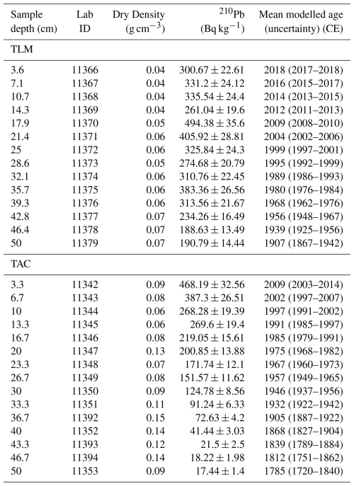 Age-depth models were constructed using the Bayesian Plum algorithm from the rplum package version 0.5.1 in R (Aquino-López et al., 2018; Blaauw et al., 2024), which integrates 14C and 210Pb data. While the 210Pb profile from TAC reached the supported level, the profile for TLM did not extend deep enough to clearly identify it. However, because Plum uses prior information to estimate supported 210Pb activity, we applied the supported level measured in TAC (supported mean = 17.5 Bq kg−1) as a prior for TLM (Aquino-López et al., 2018; Chartrand et al., 2023; Cwanek et al., 2025). This approach is appropriate given the similar sedimentary and environmental conditions at the two nearby sites and allowed us to derive a reliable 210Pb-based chronology for TLM despite the data limitation.
