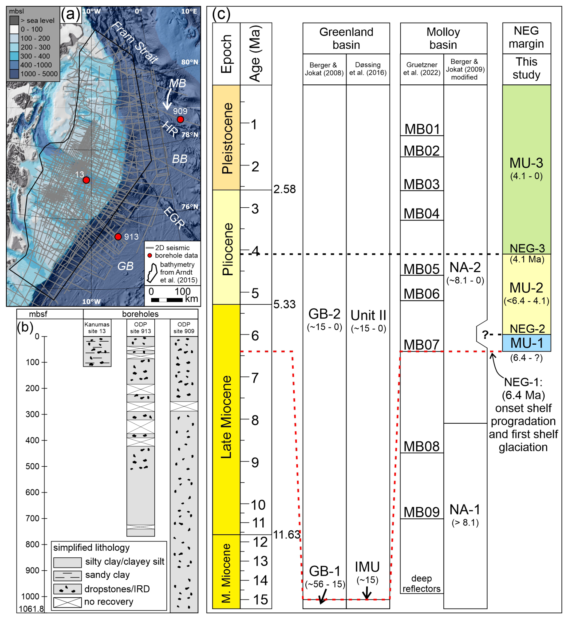 Figure 2(a) Coverage of bathymetry, borehole data and seismic data used in this study. 909 and 913 refers to ODP Sites while 13 refers to Kanumas Site. MB: Molloy Basin. BB: Boreas Basin. GB: Greenland Basin. HR: Hovgaard Ridge. EGR: East Greenland Ridge. (b) Simplified lithological description of the cores used in this study compiled and modified from Myhre et al. (1995) and StatoilHydro (2008). mbsf = meters below seafloor. (c) Chronostratigraphic overview of the outer Greenland margin, focusing on the presently established chronology in Greenland Basin (Berger and Jokat, 2008; Døssing et al., 2016), Molloy Basin (Berger and Jokat, 2009; Gruetzner et al., 2022) and their correlation to this study (dashed lines). The age of the boundaries from Berger and Jokat (2009) have been adjusted using the new age model from Gruetzner et al. (2022). NEG: Northeast Greenland. IMU: intra-Miocene unconformity. Seismic data made available for this study courtesy of AWI, TGS, GEUS and GNPDR.