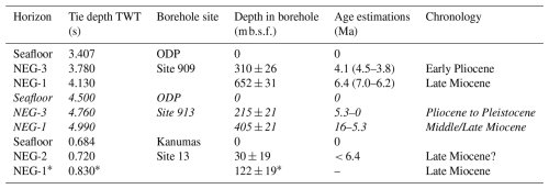 Table 2Seismic-borehole tie-depths for the key reflections from this study. Vertical tie-depth is given in meters below seafloor (mb.s.f.) with an uncertainty equal to the vertical resolution of the seismic tie-line (Table 1). Age estimates from ODP Site 909 and Site 913 are based on the age models by Gruetzner et al. (2022) and Hull et al. (1996), respectively. Age range in brackets are based on the tie depth uncertainty (vertical resolution at tie depth). Normal/italic fonts separates the respective borehole sites.  Estimated depth below Kanumas Site. TWT = two-way travel time in seconds.