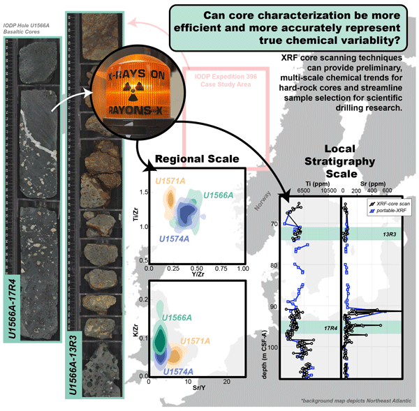 Choosing samples from large sections of hard-rock cores often relies on preliminary chemical analyses, which can be limited and therefore misrepresentative of full chemical variability. This study adapts X-ray fluorescence core-scanning techniques for use on hard-rock basalt cores to outline a method that provides accurate chemical information in greater detail relative to traditional analytical methods. The presented workflow suggests significant contributions to new and legacy core research.