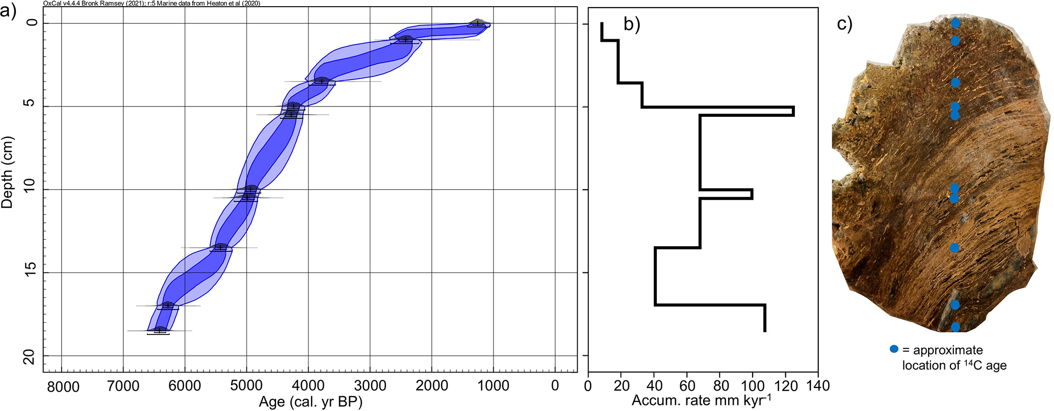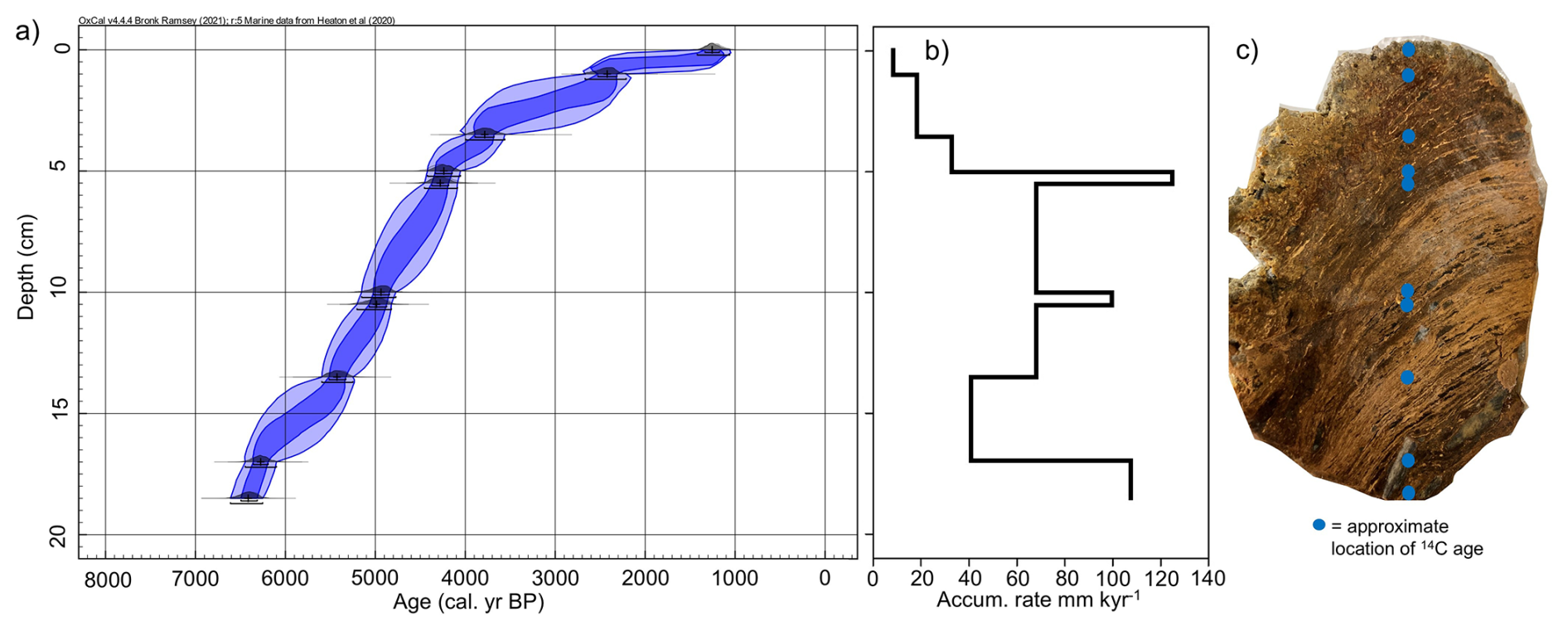 Figure 2(a) Bayesian 14C-AMS age-depth model for stomach oil deposit 3012MUM2, generated in OxCal (Bronk Ramsey, 2009) applying a reservoir offset (ΔRHolocene 670 ± 50 years (Björck et al., 1991) calibrated to calendar ages using MARINE20 (Heaton et al., 2020). Dark blue ellipse indicates 68.3 % range, light blue ellipse indicates 95.4 % range. (b) Accumulation rate between age control points calculated from median ages in the Bayesian model in (a). (c) Photograph of stomach oil deposit 3012MUM2 after sectioning, complete with approximate location of 14C ages in blue dots. Constrained hierarchical cluster analysis was used to determine three significant clusters (Org A–C) using organic parameters in rioja (Juggins, 2020) and the broken-stick model (Bennett, 1996).