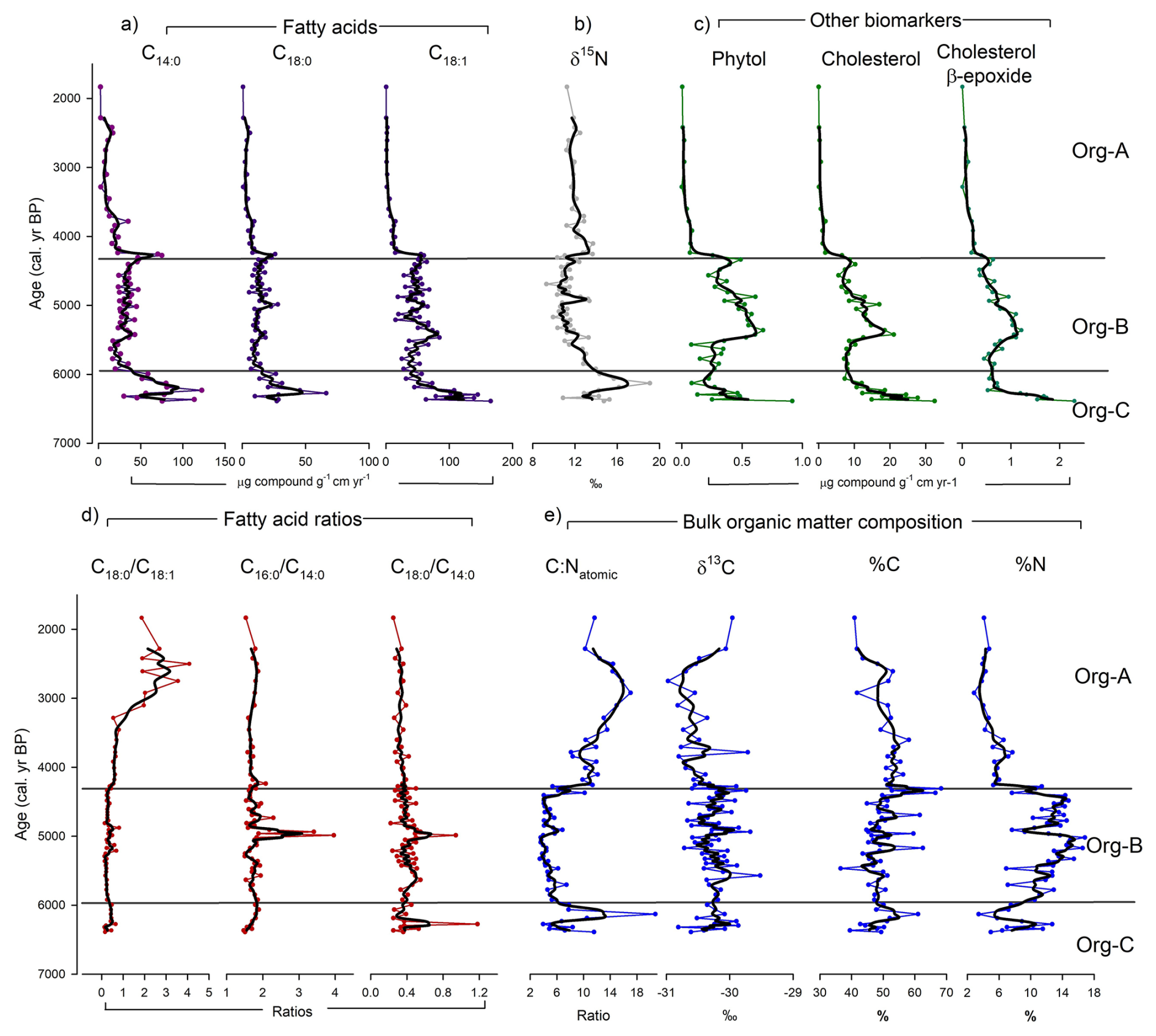 The transition to zone B ( 5960 cal. yr BP) is marked by a rapid decrease in C14:0 (FA), C16:0 (FA) and C18:0 (FA) fatty acid fluxes which thereafter remained broadly stable throughout the zone (Figs. 3, S2). Zone Org-B has markedly lower δ15N than zone Org-C, fluctuating between  9 ‰ and 13 ‰. In contrast, the C16:1 (FA) and C18:1(n-9) (FA) fatty acid concentrations decreased from around 5400 cal. yr BP to the top of zone Org-B, which is also observed in phytol and cholesterol from  5100 cal. yr BP (Figs. S2 and S3). The major n-alkanols were markedly lower in zone Org-B compared to zone Org-C (Fig. S3), with a similar trend to lower values in C:Natomic ratio (Fig. 3). Notably, at  4900 cal. yr. BP there was a short-lived unusual interval of high δ15N, high C16:0/C14:0 (FA), C18:0/C14:0 (FA) and a small increase in C:N ratio (Fig. 3). Organic carbon composition was variable in zone Org-B, fluctuation between 30.7 ‰ to 29.5 ‰ for δ13C, and between  36.6 % to 66 % for %C (Fig. 3). Other biomarkers of sterols, stanols and cholesterol derivatives were generally high at the bottom of zone Org-B ( 5960 cal. yr BP), typically decreasing by the top ( 4320 cal. yr BP) (Fig. S4).