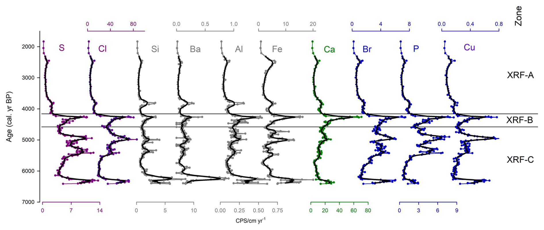 Cluster analysis identified three major XRF clusters: XRF-C (6390–4570 cal. yr BP); XRF-B (4570–4180 cal. yr BP); XRF-A (4180–1830 cal. yr BP). Zone XRF-C broadly coincides with organic zone Org-C and B, with XRF-B aligning (although slightly offset) with the uppermost part of zone Org-B. Zones XRF-A and zone Org-A are broadly aligned.