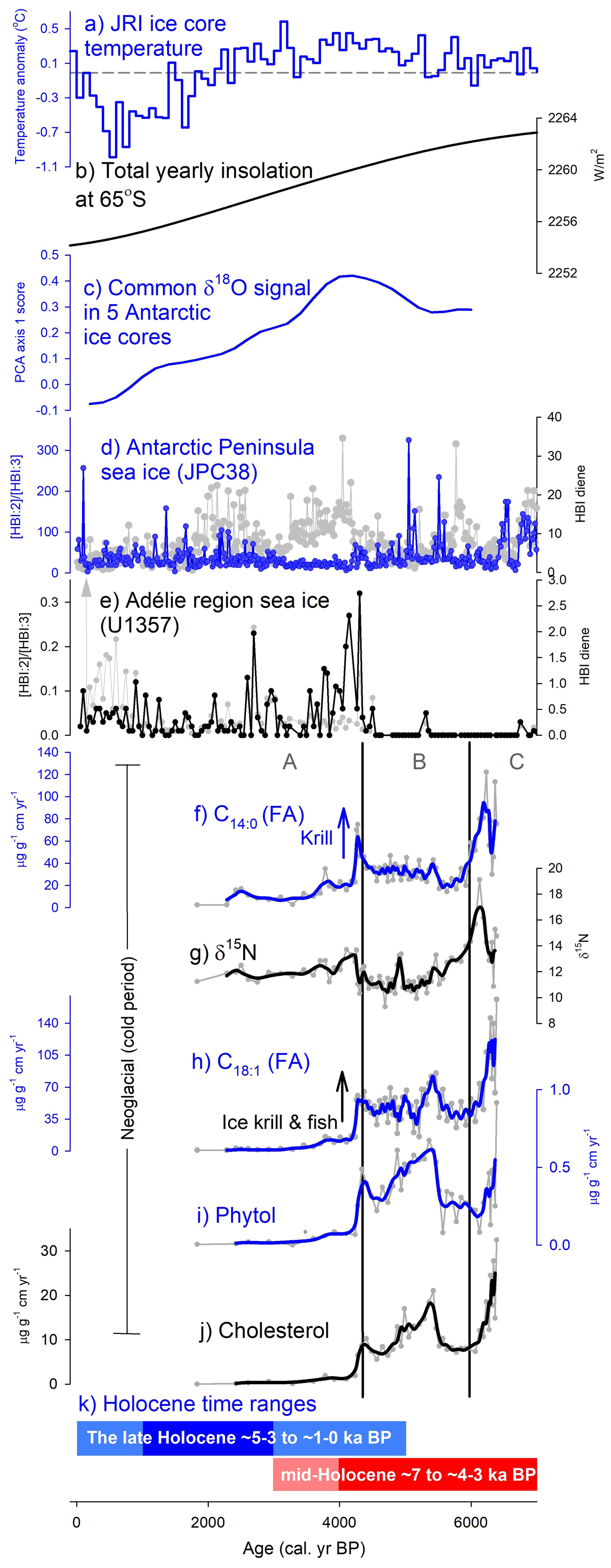 Figure 5Summary plot comparing the marine and ice-core climate proxies (a–e) with 3012MUM2 geochemical proxy data (f–j). (a) James Ross Island (JRI) ice core temperature anomaly relative to 1961–1990 mean based on 100 year averages in Mulvaney et al. (2012); (b) Total yearly insolation at 65° S (Laskar et al., 2004); (c) Common δ18O signal in 5 Antarctic ice cores, interpreted by PCA axis 1 scores from Hodgson and Bentley (2013) based on common and residual signals in five Antarctic δ18O records; Vostok, Taylor Dome, EPICA Dome C, EPICA Dronning Maud Land and Dome Fuji (Masson-Delmotte et al., 2011); (d) Antarctic Peninsula sea ice from the ratio of highly-branched isoprenoid (HBI) diene to triene and HBI diene individually (core JPC38) (Barbara et al., 2016); (e) Adélie region sea ice from the ratio of HBI diene to triene and HBI diene individually (core U1257) (Ashley et al., 2021); (f) C14:0 (FA) flux as a krill maker; (g) nitrogen stable isotopes (δ15N); (h) C18:1(n-9) (FA) flux as an ice krill and fish marker; (i) phytol flux as a productivity marker; (j) cholesterol flux; and (k) Holocene time ranges for palaeoclimate periods from Crosta et al. (2022). Smooth lines are calculated from moving averages. Cluster boundaries (vertical black lines) are based on zones Org-A–C in Fig. 3.