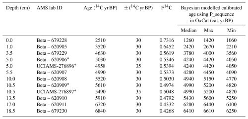 Table 1Radiocarbon dates including raw 14C, F14C and Bayesian calibrated ages for the 3012MUM2 sequence. Samples analysed by BETA Analytic (Florida) 14C-AMS were prepared without acidification. Repeat analyses at 5 and 10.5 cm were prepared at SUERC Radiocarbon Laboratory using acidification and run for 14C-AMS at UC Irvine Keck Carbon Cycle laboratory. A reservoir offset based on closest Holocene ΔR of 670 ± 50 years (Björck et al., 1991) was used, following previous studies (McClymont et al., 2022) and converted to calendar ages using the MARINE20 calibration (Heaton et al., 2020). All dates (14C and calibrated) rounded to nearest 10 calendar years for presentation, original measured dates are available at Pangaea (https://doi.org/10.1594/PANGAEA.980519, Stevenson et al., 2025). The Bayesian model output is shown in Fig. 2.
