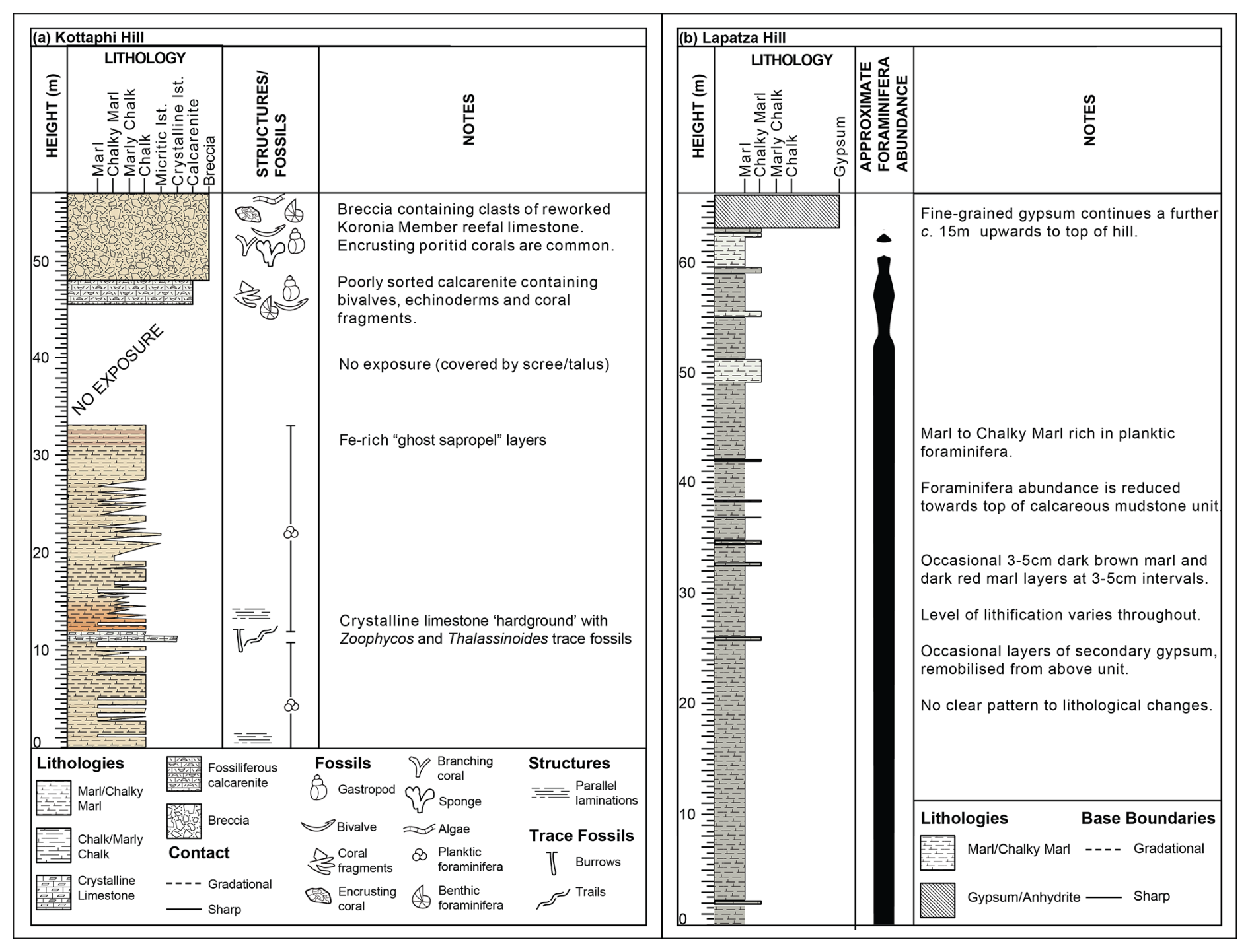 Figure 3Simplified stratigraphic logs of (a) the Kottaphi Hill succession showing the occurrence of sedimentary structures and fossils up the succession and (b) the Lapatza Hill succession showing the approximate abundance of planktic foraminifera and the main lithological changes up the succession.