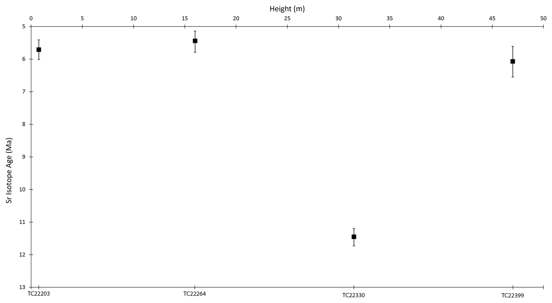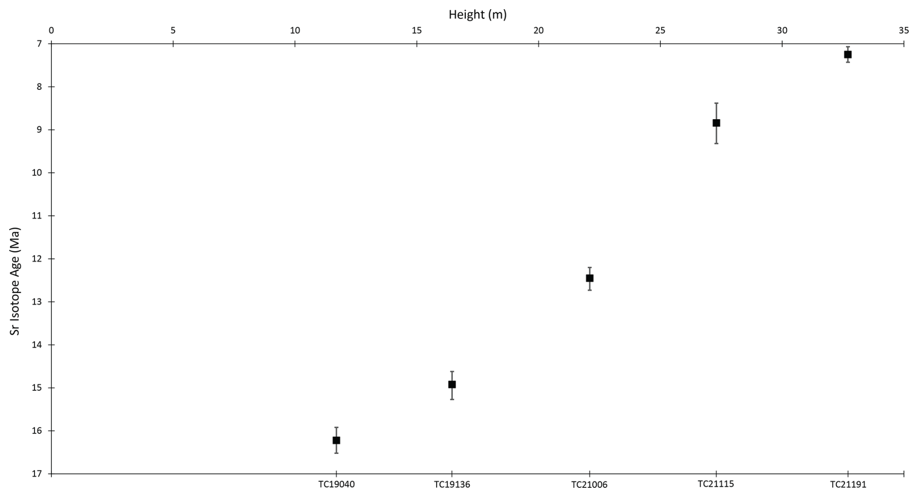 Figure 5Sr age data for planktic foraminiferal samples from Kottaphi Hill plotted against absolute age. The determined age and the total combined error are shown for each sample.