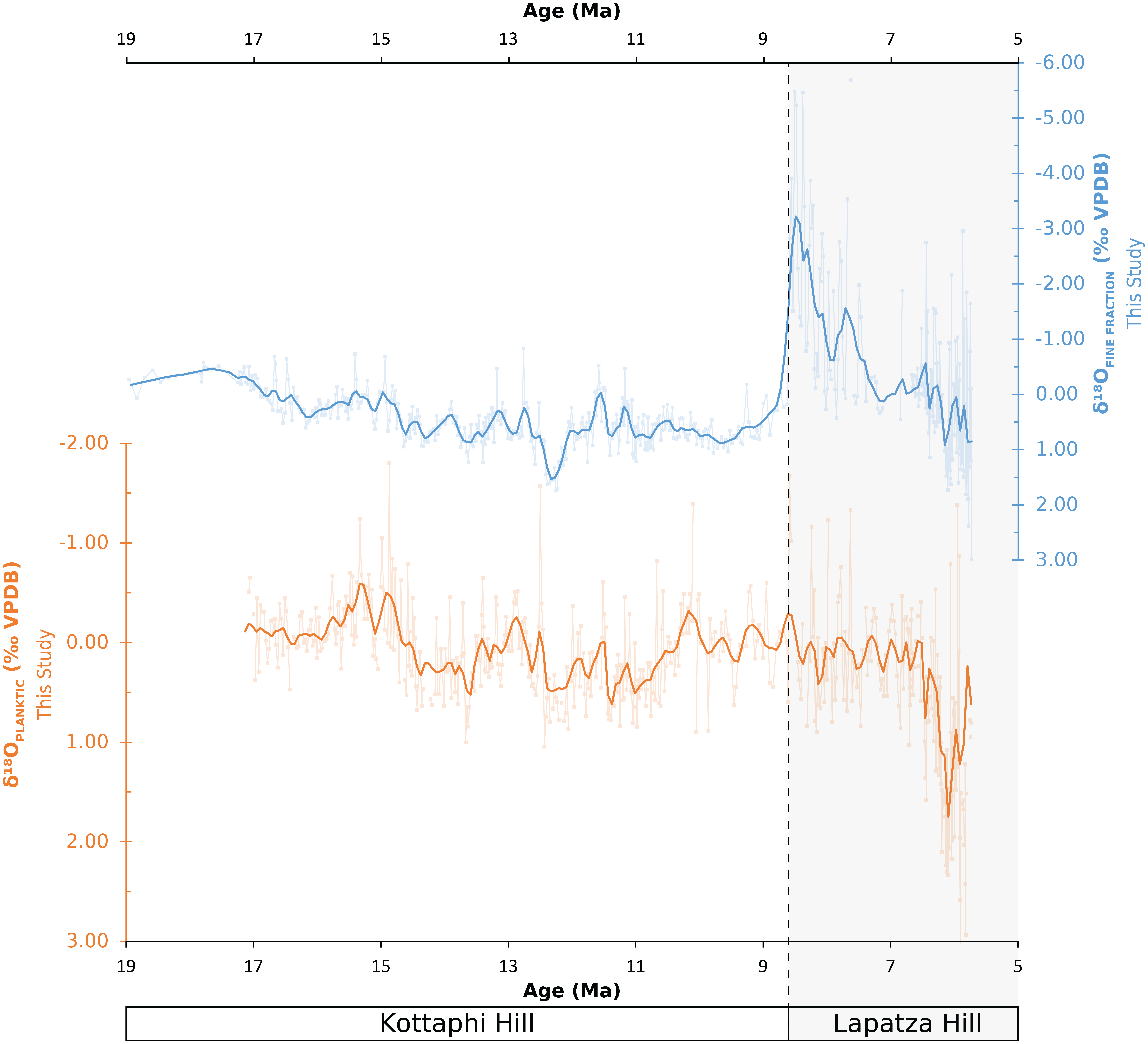 The two sampled successions were combined to produce the composite temporal record. Figures showing the age model, together with the points used for its construction and the sedimentation rates derived from the age models for both sections, are provided in the Supplement. The composite temporal record points to any changes in climatic and environmental conditions throughout the whole of the time interval of interest. A small peak of more positive δ18O values in the δ18Oplanktic record is noted in both successions at 8.60 Ma. This level (8.60 Ma) was selected as the splice point to combine the two records, thus creating the representative composite record, taking account of the similarity in δ18Oplanktic, δ18Ofine fraction, δ13Cplanktic, and δ13Cfine fraction trends and values at this level. These spliced intervals provide a ca. 13.2 Myr record, from 18.95 Ma (Burdigalian) to 5.74 Ma (Messinian). This composite record covers the whole of the time interval of interest, from the onset of the Miocene Climatic Optimum to the onset of the Messinian Salinity Crisis.
