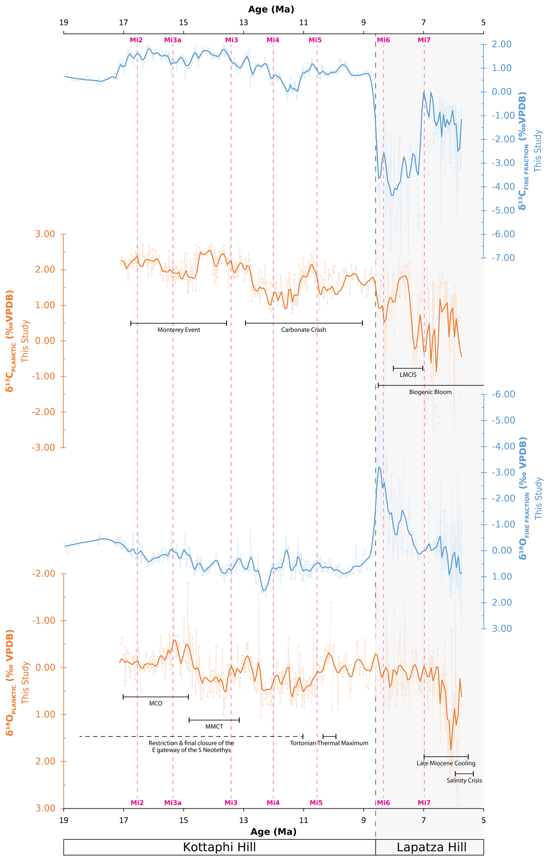 Here, we present new oxygen and carbon stable isotope records from Lower to Upper Miocene deep-marine sediments in Cyprus, which provide an excellent reference for the eastern Mediterranean Sea. This new record was constructed in order to better understand the role and interplay of global climatic and regional to local tectonic events in the eastern Mediterranean region during the Miocene.