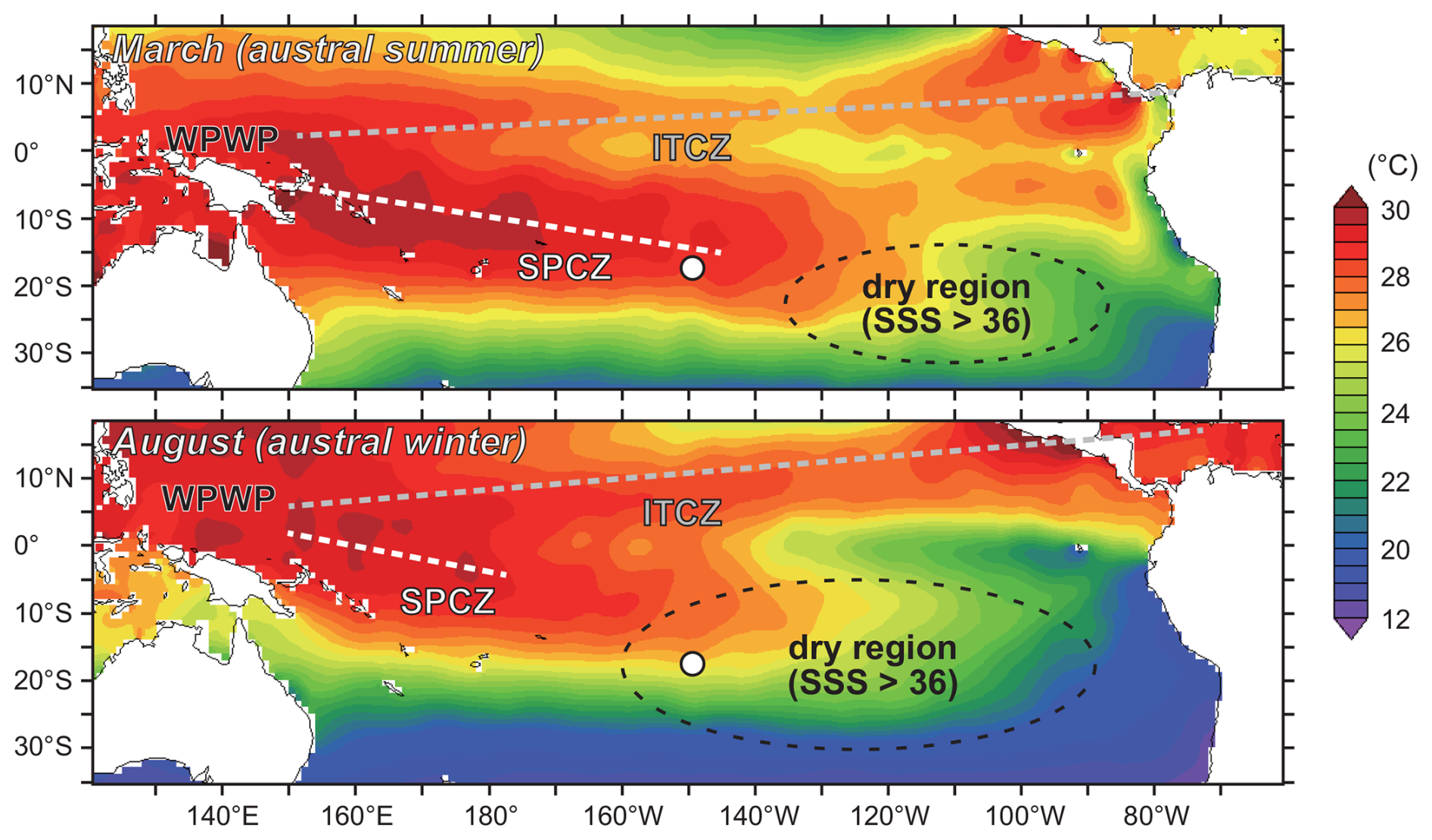 Figure 1Study site in the Pacific Ocean. The coral samples used in this study were drilled at the fore-reef slope off the northern coast of the island of Tahiti (white dot) by IODP Expedition 310 (Camoin et al., 2007). Modern mean SST distributions during austral summer (March) and winter (August) for 1981–2010, approximate mean positions of the WPWP, ITCZ (gray dashed line), SPCZ (white dashed line), and the subtropical dry region (black dashed circle) with high sea surface salinity of >36 are shown. SST data from World Ocean Atlas 2018 (National Centers for Environmental Information, NOAA) (Locarnini et al., 2018; Zweng et al., 2018).