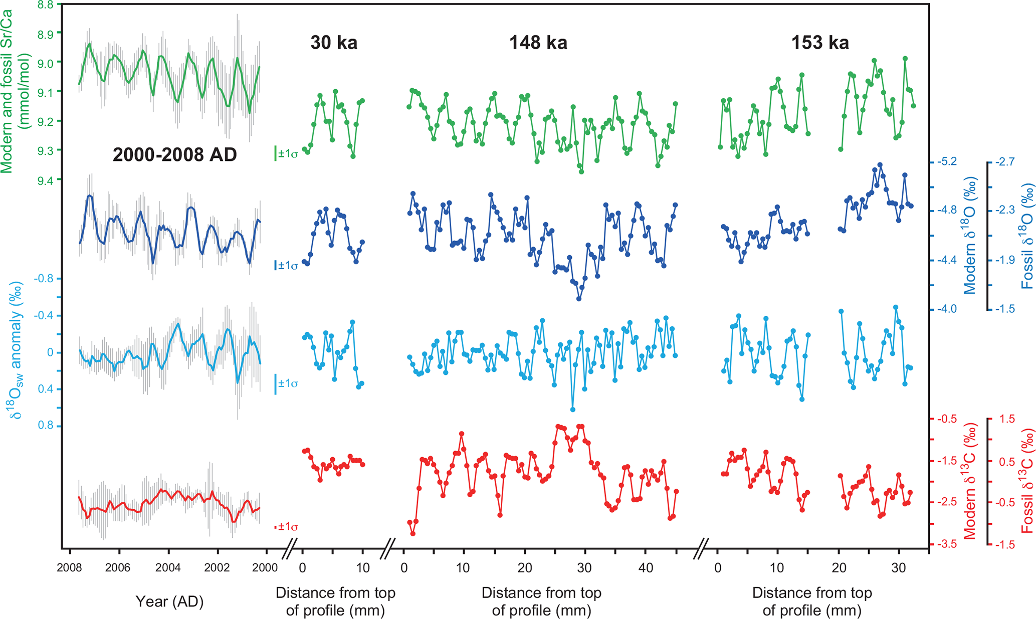 The coral values range from 8.99 to 9.32 mmol mol−1 for 153 ka, 9.10 to 9.38 mmol mol−1 for 148 ka, and 9.10 to 9.32 mmol mol−1 for 30 ka, revealing about 6, 9, and 2.5 annual cycles, respectively (Fig. 4). The annual maximum and minimum values average 9.28±0.04 and 9.06±0.06 mmol mol−1 for 153 ka, 9.31±0.04 and 9.14±0.03 mmol mol−1 for 148 ka, and 9.30±0.03 and 9.12±0.02 mmol mol−1 for 30 ka, corresponding to annual minimum and maximum SSTs recorded in winter and summer, respectively. The coral δ18O (δ13C) values range from −2.67 ‰ (−0.84 ‰) to −1.88 ‰ (0.74 ‰) for 153 ka, from −2.42 ‰ (−1.25 ‰) to −1.58 ‰ (1.31 ‰) for 148 ka, and from −2.31 ‰ (0.02 ‰) to −1.87 ‰ (0.73 ‰) for 30 ka.