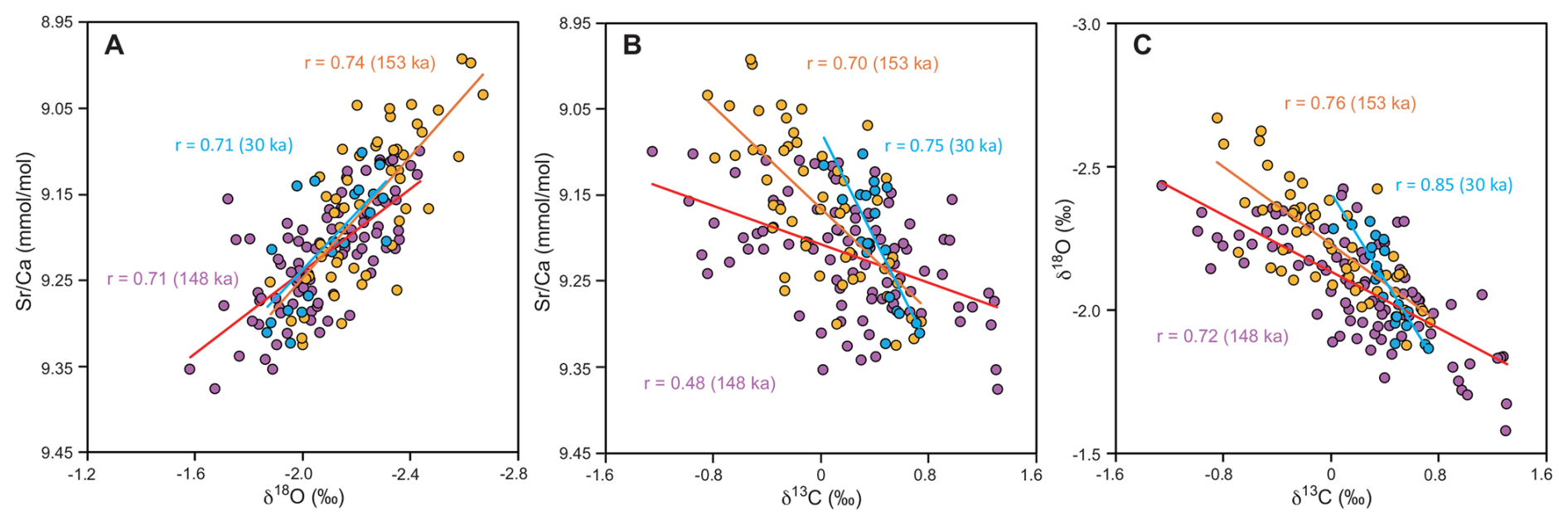 Figure 5Cross plots of the geochemical records (A: vs. δ18O, B: vs. δ13C, C: δ18O vs. δ13C) in fossil Tahiti corals (blue, 30 ka; purple, 148 ka; orange, 153 ka).