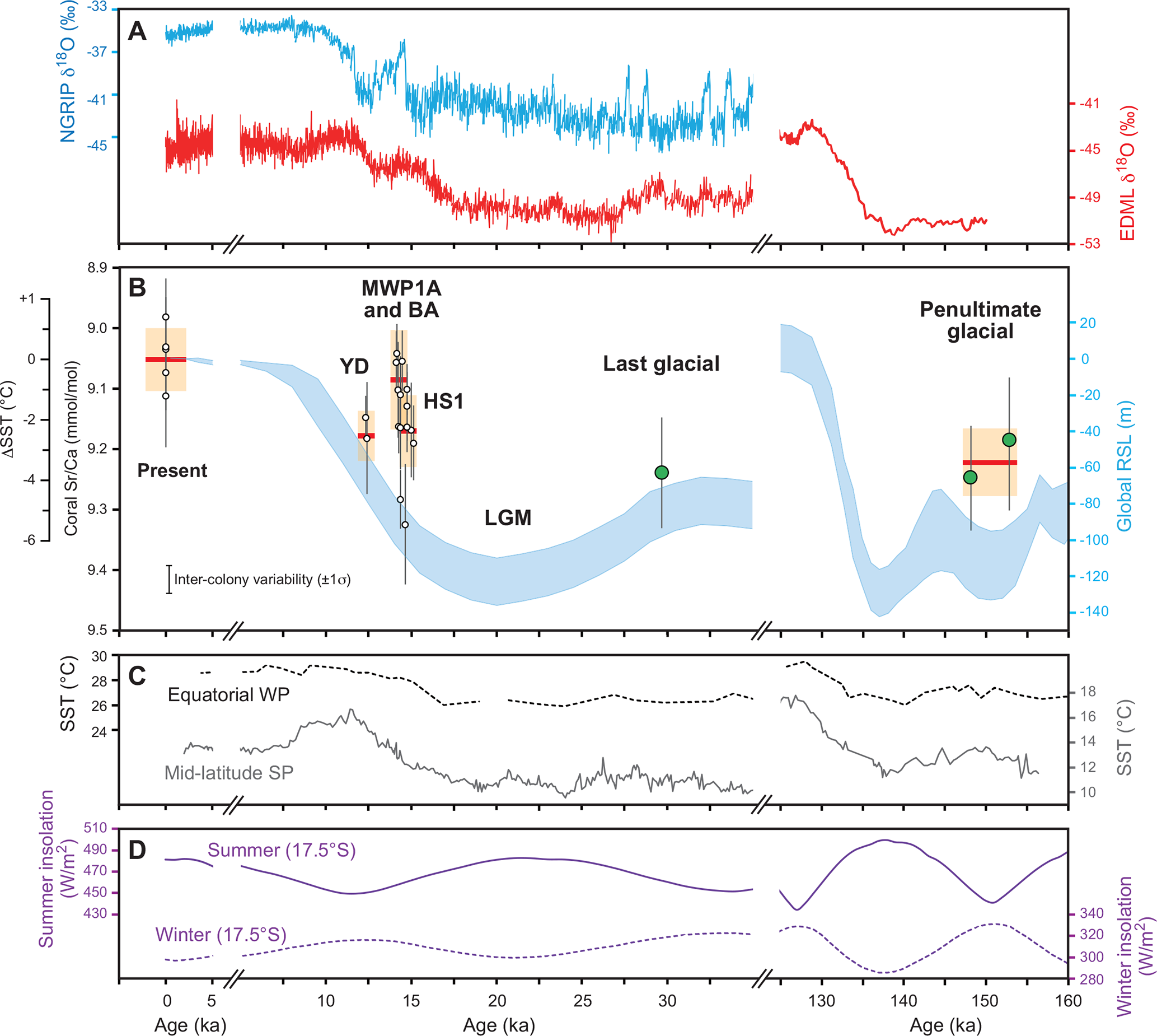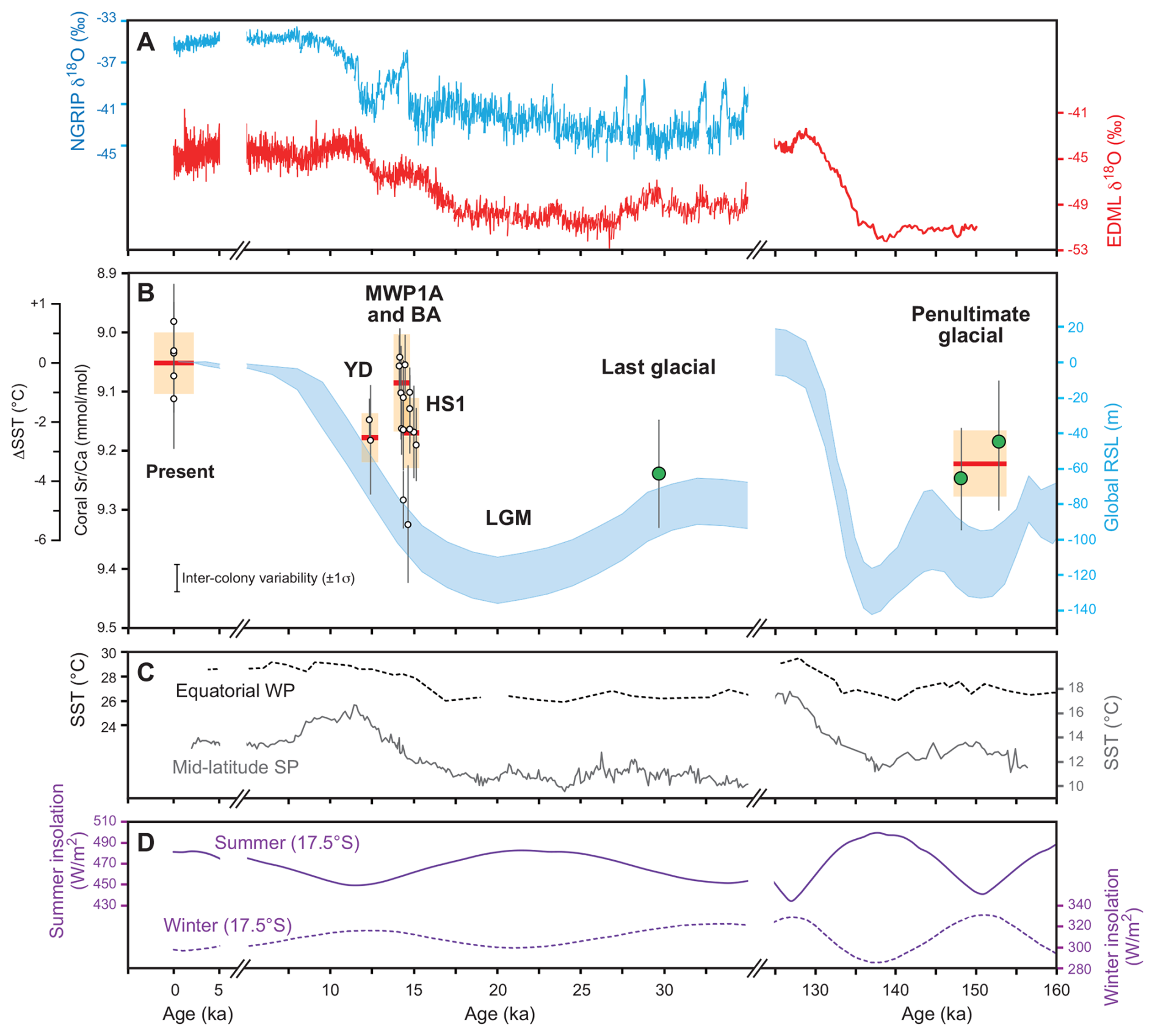 Figure 6Temperature proxy records from Tahiti corals and paleoclimate records for the penultimate glacial, last glacial, last deglacial, and present. (A) Greenland (NGRIP, Rasmussen et al., 2006) and Antarctica (EDML, EPICA Community Members, 2006) ice core δ18O records. (B) Annual mean of sub-seasonally resolved modern and fossil Tahiti corals (white symbols, Asami et al., 2009; Hathorne et al., 2011; Felis et al., 2012; Knebel et al., 2024; green, this study). Vertical bars: Mean seasonality. Red horizontal bars: Weighted average of colony means for given interval (penultimate glacial, HS1: Heinrich Stadial 1, MWP1A: Melt-Water Pulse 1A, BA: Bølling–Allerød, YD: Younger Dryas, present: 2000–2008 AD) with uncertainty (CE: combined error, light orange area). The JCp-1 value representative for the coral values shown is 8.901 mmol mol−1 (Knebel et al., 2024). Corrected for seawater changes by sea-level dependency at a given age (Waelbroeck et al., 2002) assuming seawater 0.5 % higher than present (8.539 mmol mol−1) at the Last Glacial Maximum (LGM) (Stoll and Schrag, 1998; de Villiers, 1999). Reconstructed SST anomaly relative to today based on modern Tahiti coral -SST relationship ( mmol mol−1 °C−1, Knebel et al., 2024). The inter-colony variability (±1σ) estimated from modern Tahiti corals (Knebel et al., 2024) is shown. The light blue belt denotes a range of maximum and minimum global sea level inferred from benthic foraminiferal δ18O records (Waelbroeck et al., 2002). (C) Equatorial western Pacific SST from foraminiferal (ODP 806B, Medina-Elizalde and Lea, 2005) and South Pacific mid-latitude SST from alkenones (MD97-2120, Sikes and Volkman, 1993; Pahnke and Sachs, 2006). (D) Summer and winter insolation at the latitude of Tahiti (17.5° S) (Laskar et al., 2004).