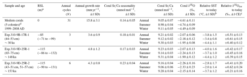 The skeletal growth rates based on annual cycles are 4.3 mm yr−1 for 153 ka, 4.8 mm yr−1 for 148 ka, and 3.6 mm yr−1 for 30 ka, which is substantially lower than 15.8 mm yr−1 for modern Tahiti corals (Knebel et al., 2024). The lower growth rates are likely a result of lower SST during glacial periods. It is noted that the effects of coral growth on geochemical records should be carefully considered for paleo-temperature estimations (see Sect. 3.2).