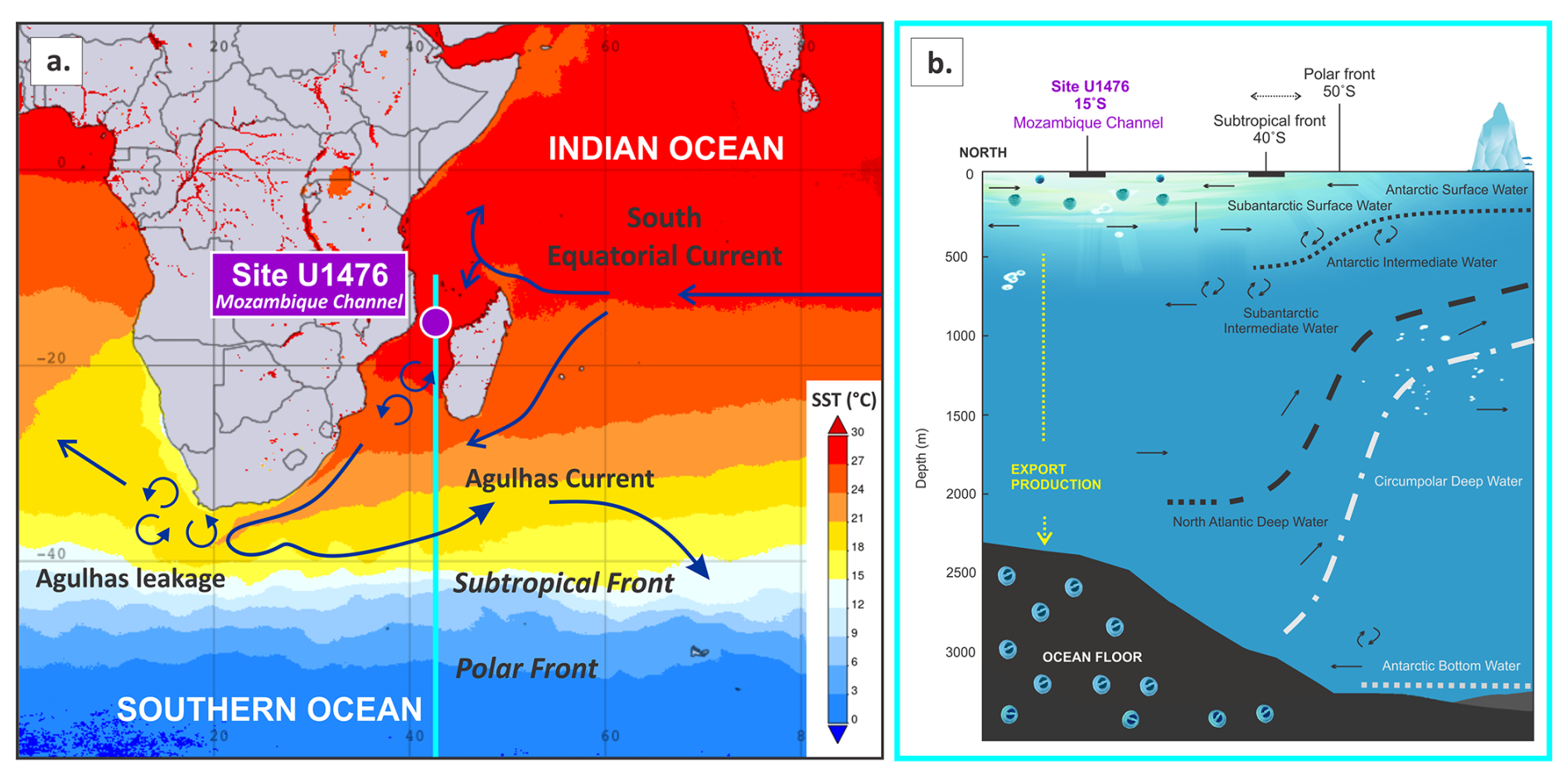 Figure 1(a) Sea surface temperature (SST, °C; Acker and Leptoukh, 2007) and major currents in the Indian Ocean (Beal et al., 2011), showing the location of IODP Site U1476 in the Mozambique Channel. (b) Schematic cross-section showing the position of Site U1476 relative to major water masses (adapted from Westall and Fenner, 1991) and the Southern Ocean fronts.