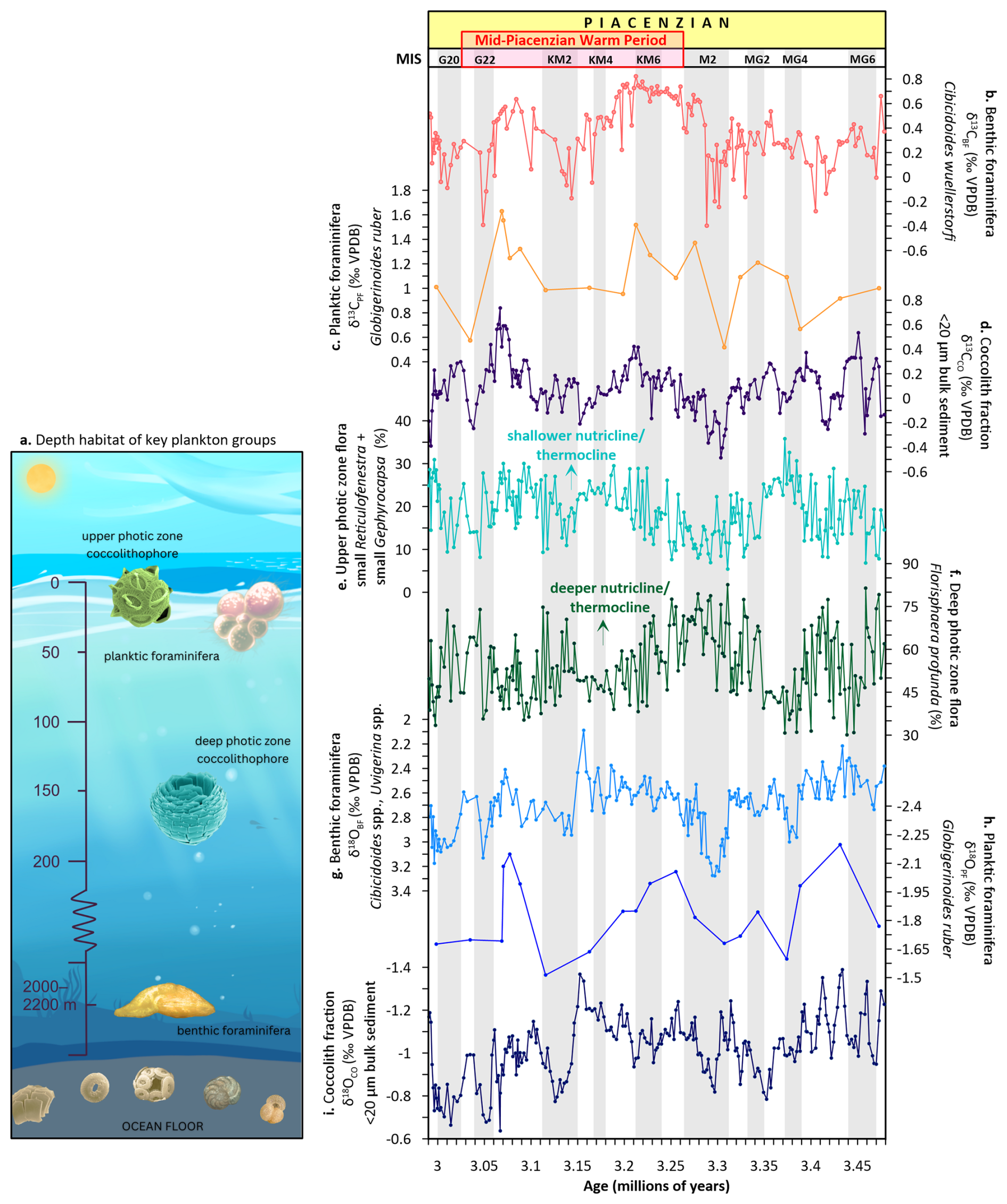 Coccolith δ18O (δ18OCO) values range from 1.39 ‰ to 0.64 ‰, with an average of 1.03 ‰ (Fig. 2i). Although coccolithophores are typically photosynthetic and inhabit the upper photic zone, the heavier δ18OCO compared to G. ruber suggests that a significant portion of this community's coccolith calcification may have occurred deeper within the photic zone. This interpretation assumes that both coccolithophores and G. ruber record similar seasonal conditions and reflect the δ18O of ambient seawater without significant species-specific vital-effect offsets on δ18O. Consistent with the δ13CCO recorded here, this contradicts the notion that coccolithophores calcify in shallower waters than G. ruber, which generally resides in the upper mixed layer. The heavier δ18OCO values could indicate significant contributions from deeper-dwelling coccolithophore species, especially those inhabiting the lower photic zone (up to  200 m), such as F. profunda (Winter et al., 1994), supporting the interpretation that the coccolith fraction integrates signals from a broader vertical range of the photic zone, including thermally and isotopically distinct layers. Accordingly, the vertical gradient observed in δ18O, from heavier values in benthic foraminifera, to intermediate values in coccoliths, and the lightest values in G. ruber, indicates a stratified ocean structure, where δ18OCO represents conditions within the mid to lower photic zone, potentially influenced by deeper-dwelling species rather than solely the surface mixed layer. These differences in δ13C and δ18O values between the three plankton groups thus offer valuable insights into the vertical structure of the Pliocene water column and help constrain the ecological depth habitat of these plankton communities.