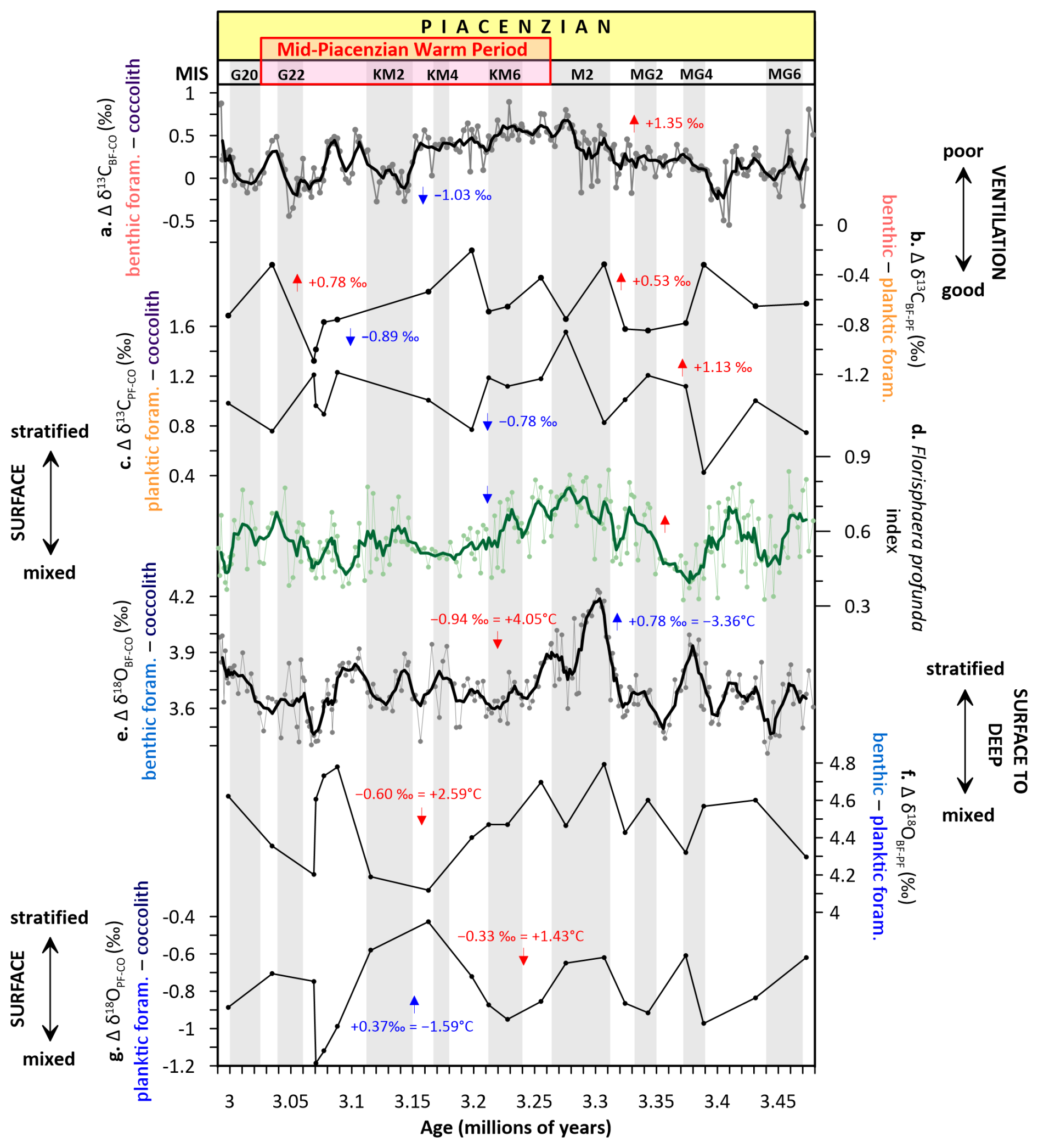 During the mPWP, a sharp collapse in vertical δ13C gradients during MIS KM2 is observed: Δδ13CBF−CO declines by 1.03 ‰ (Fig. 3a), and Δδ13CBF−PF by 0.89 ‰ (Fig. 3b), and Δδ13CPF−CO by 0.78 ‰ (Fig. 3c). These shifts indicate a breakdown in vertical carbon reservoir separation and suggest a pulse of enhanced ventilation, consistent with Northern Hemisphere glaciation and global cooling events documented in other records (De Schepper et al., 2014; McClymont et al., 2023). In parallel, δ18O gradients decline: the Δδ18OBF−CO decreases by 0.94 ‰ (equivalent to +4.05 °C warming; Fig. 3e), the benthic–planktic foraminifera δ18O gradient (Δδ18OBF−PF) by 0.60 ‰ (+2.59 °C warming; Fig. 3f), and the Δδ18OPF−CO by 0.33 ‰ (+1.43 °C warming; Fig. 3g), collectively pointing to surface and subsurface warming and a deepening of the thermocline. However, the F. profunda index declines during this period, supporting enhanced surface mixing, possibly from lateral advection of nutrients carried by the East African Coastal Current (Tangunan et al., 2017), which may have supported sustained productivity and an increase in the upper photic species (Fig. 2e), despite an overall background of stratified conditions (Lawrence et al., 2006).