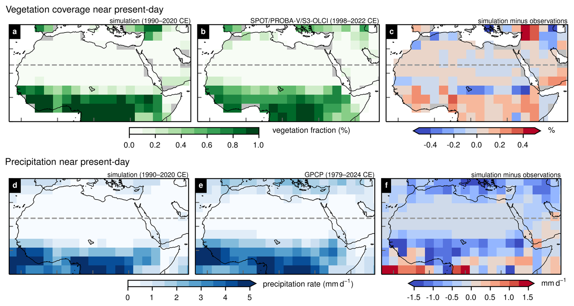 Figure C1Comparison in northern Africa of simulated present-day (1990–2020 CE) conditions to observational products for (a–c) vegetation cover fractions and (d–f) daily precipitation rates. (b) Vegetation cover data are from the SPOT/PROBA-V and PROBA-V/S3-OLCI products of the land service of Copernicus (Baret et al., 2013; Camacho et al., 2013). (e) Precipitation data are from the Global Precipitation Climatology Project (GPCP; Adler et al., 2016).