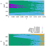To investigate the scaling laws (Eqs. 6, 7), we perform a suite of 10 Myr simulations in which we vary α and . The average periods during the first 1 Myr (P0) and the last 1 Myr (P) as a function of α and are presented in Fig. 2a and b, respectively. The range in A(0), which determines the vertical axis range in Fig. 2, was chosen based on the estimated total weathering input of CaCO3 (Milliman et al., 1999), which could give rise to alkalinity variations of up to ∼ 20 % on ∼ 100 kyr timescales (Omta et al., 2013). The lower and higher ends of the range are probably a bit less likely than the middle part of the range. There is no obvious constraint on α (horizontal axis in Fig. 2), which is why we varied that parameter by two orders of magnitude. In total, Fig. 2 encompasses the results of 12,798 simulations.