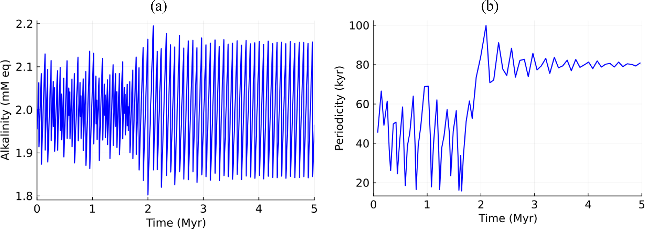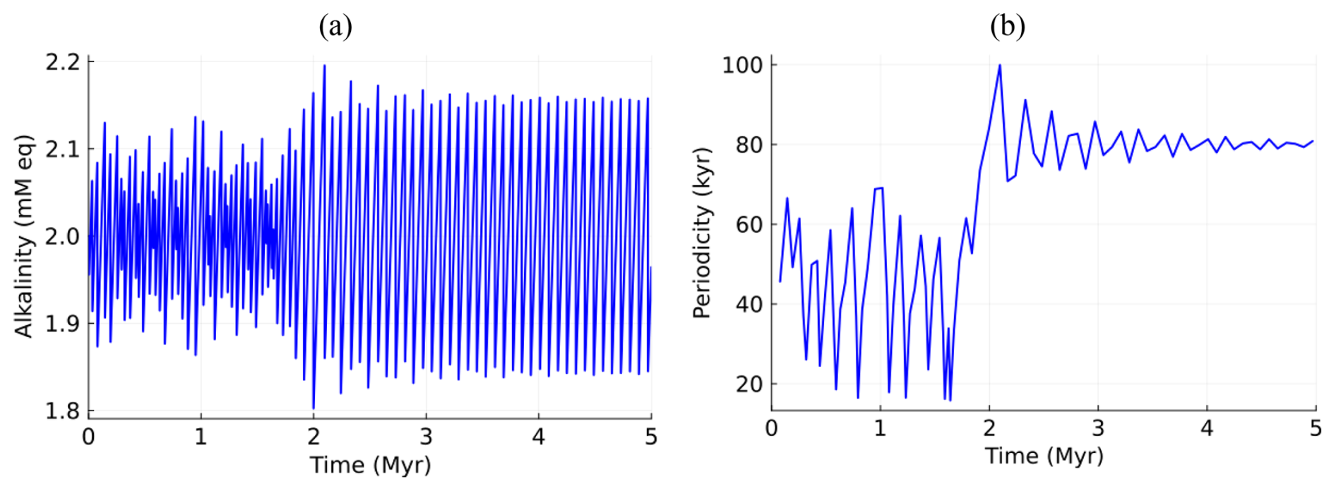 Figure 1C–A system under orbital forcing (A(0)=2.0 mM eq., mM eq., α = 0.012, T = 40 kyr): (a) alkalinity, (b) dominant period as a function of time.