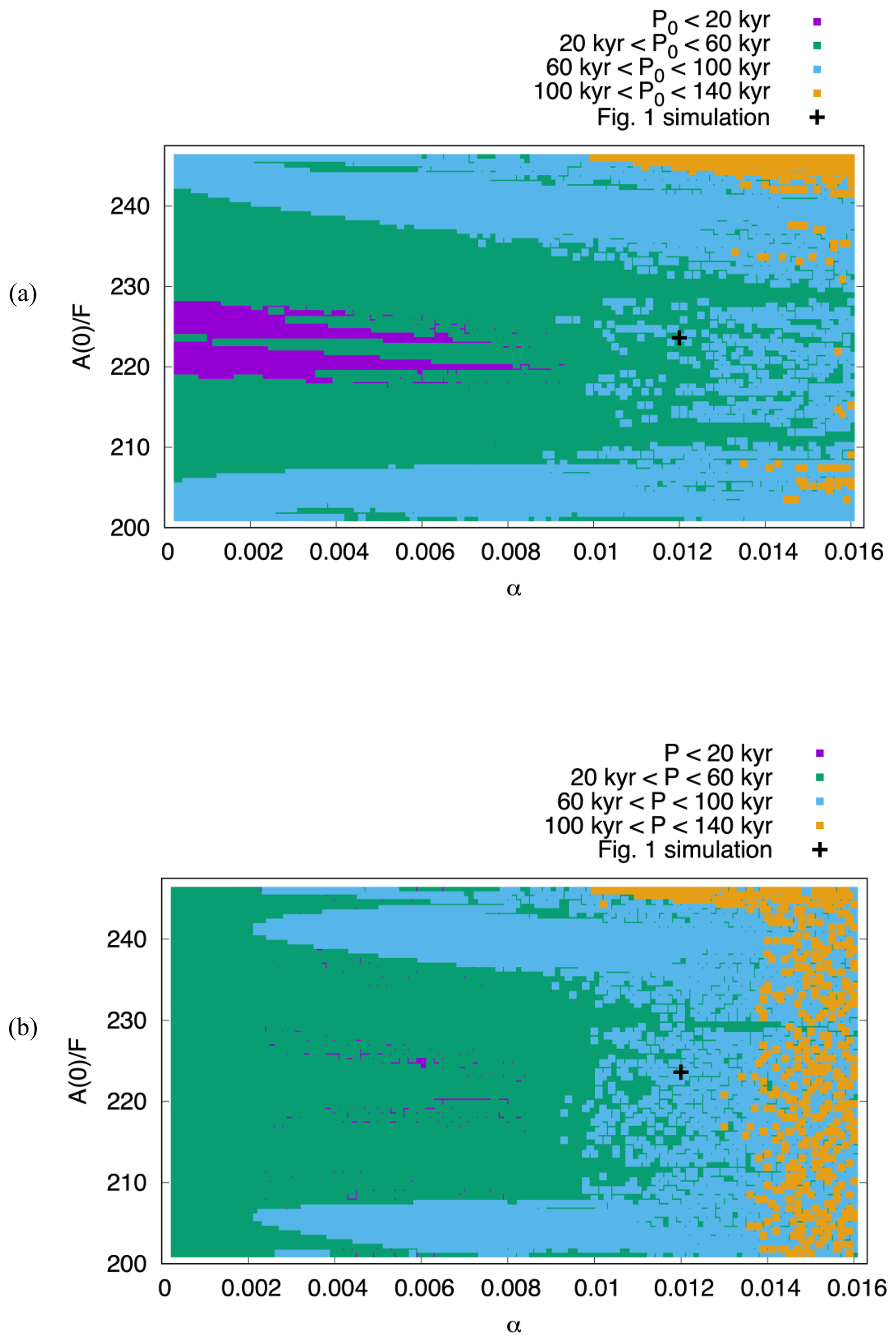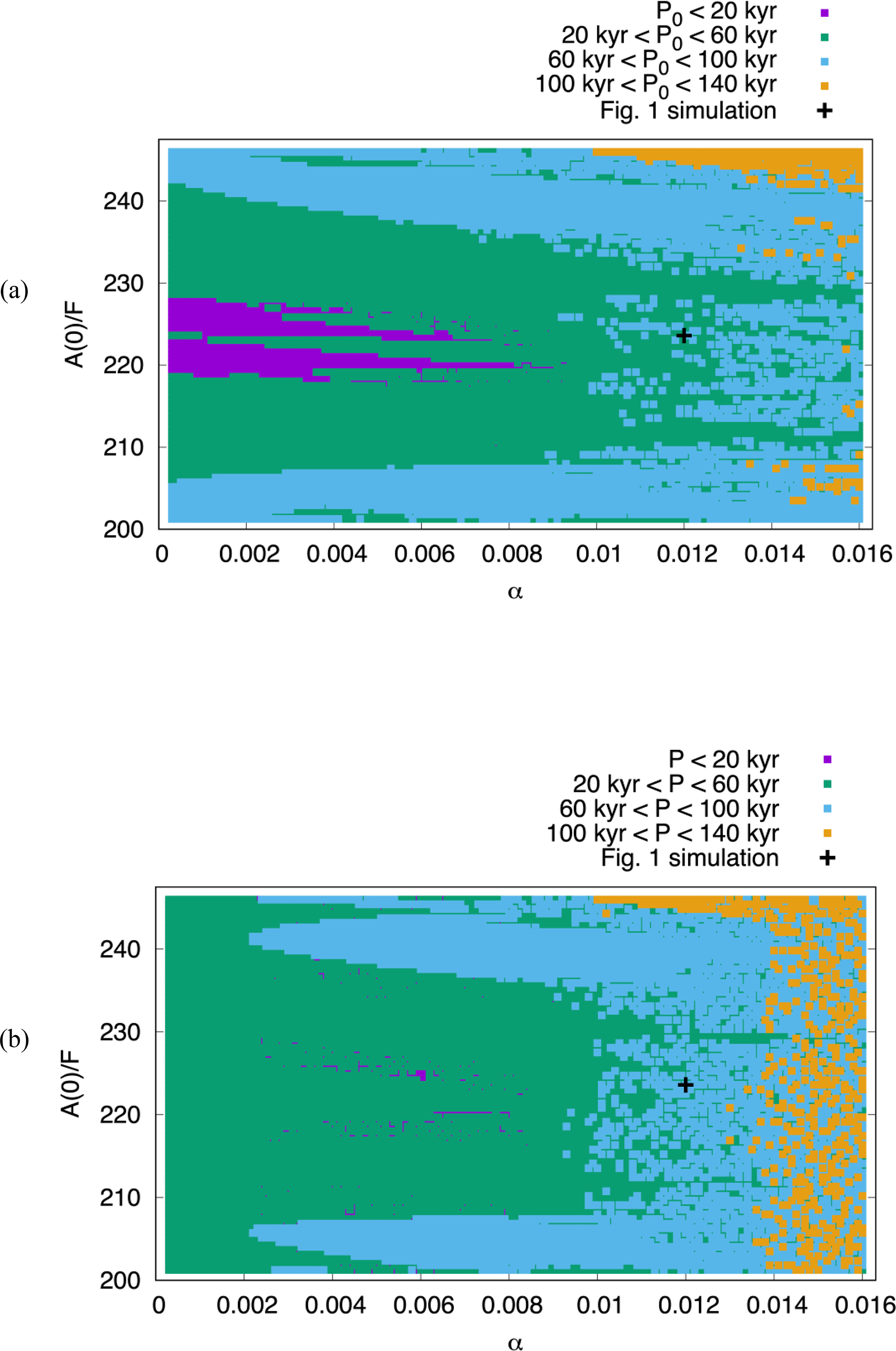 Figure 2(a) Initial periods P0 (average of first 1 Myr of 10 Myr simulations), and (b) asymptotic periods P (average of last 1 Myr of 10 Myr simulations). Each dot represents one simulation; the black cross indicates the parameter values for the simulation shown in Fig. 1. Two similarity parameters are varied: the non-dimensional forcing strength α (horizontal axis) and the scaled initial alkalinity (vertical axis). In total, Fig. 2 encompasses the results of 12 798 simulations. In all simulations, T=40 kyr and mM eq. Other parameters are kept constant at their reference values (Omta et al., 2016): M=0.1 yr−1, k0=0.05 (mol eq.)−1 m3 yr−1, mol eq. m−3 yr−1, i.e., .