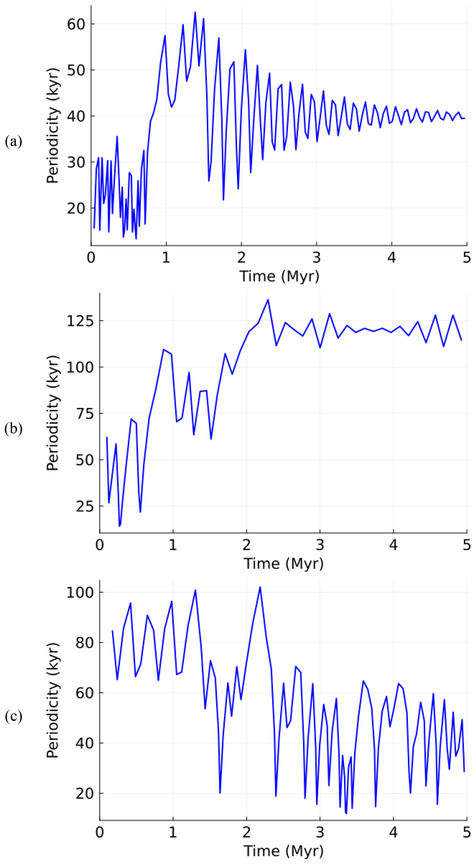 Depending on , the periodicity transition could have been not just of the 40–80 kyr type (as shown in Fig. 1), but also of a 20–40, 40–120, or even 80–40 kyr type (Fig. 3).