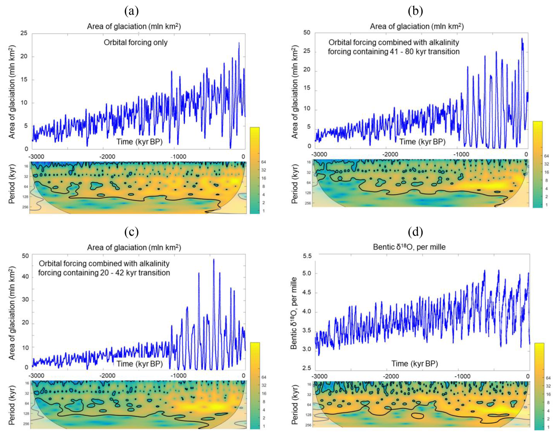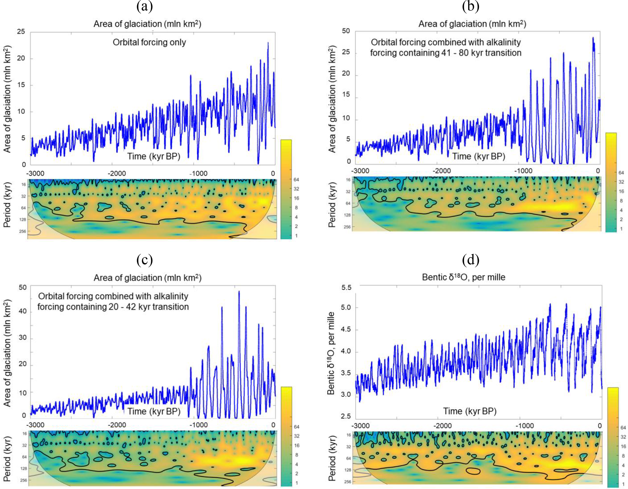 Figure 4Ice–climate system (Verbitsky et al., 2018) response to a pure orbital (a) and to a combination of orbital and alkalinity (CO2) forcing ((b) additional alkalinity (CO2) forcing contains a periodicity transition from 41 to 80 kyr, (c) additional alkalinity (CO2) forcing contains a periodicity transition from 20 to 42 kyr) presented as time series and evolutions of wavelet spectra over 3 Myr for calculated ice-sheet glaciation area (106 km2) (a–c) and for the Lisiecki and Raymo (2005) benthic δ18O record (d). The vertical axis of wavelet spectra is the period (kyr); the horizontal axis is time (kyr before present).The color scale shows the continuous Morlet wavelet amplitude, the thick line indicates the peaks with 95 % confidence, and the shaded area indicates the cone of influence for the wavelet transform.
