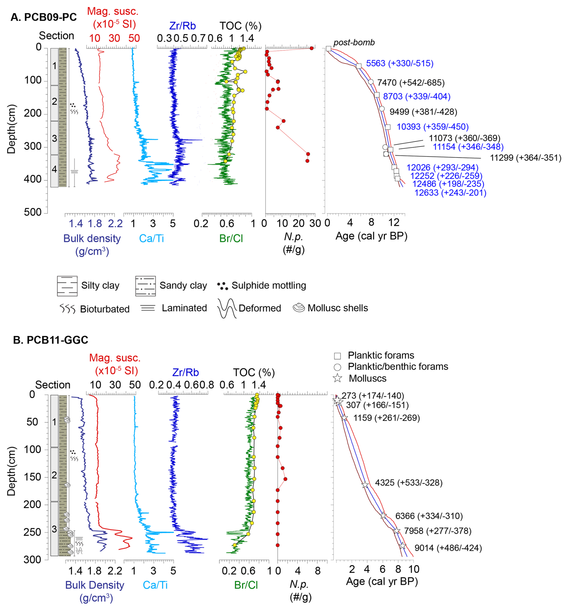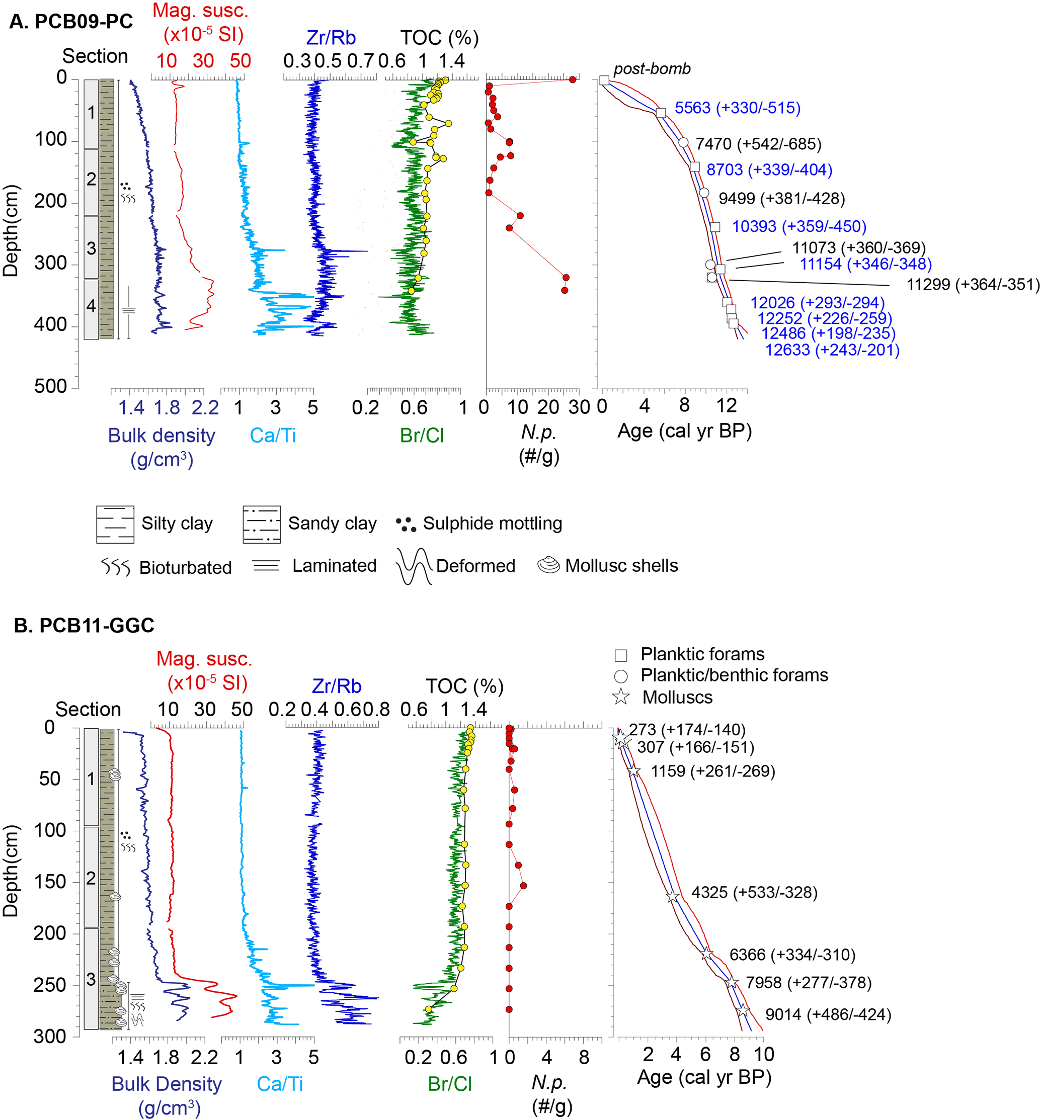 The chronology of the piston and gravity cores (Fig. 2) were determined by 14C dating of foraminifera (n = 13, PCB09) and bivalve shells (n = 7, PCB11) (Table S1). The MSCL data was used to stratigraphically correlate PCB09 with JPC15/27 (Keigwin et al., 2018) allowing us to integrate existing radiocarbon ages (n = 8) from this record with our new data (n = 5) (Fig. S3).
