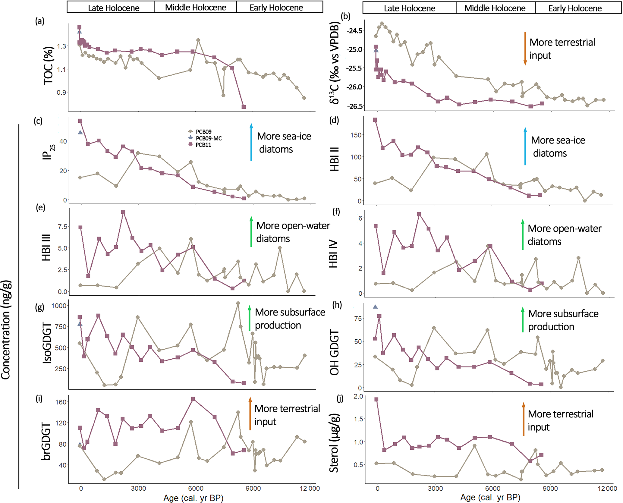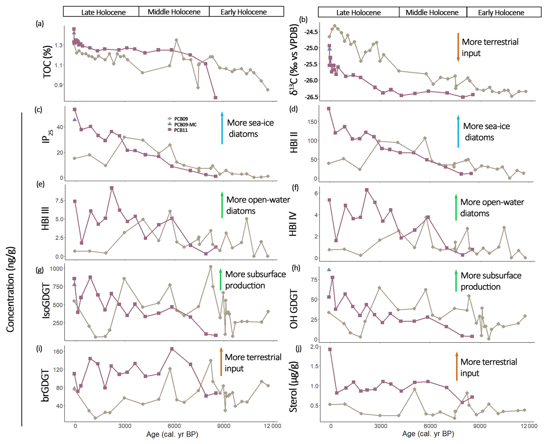 This study aims to reconstruct Holocene paleoenvironmental conditions in the southeastern Beaufort Sea focusing on spatial variability between the shelf slope (> 500 m water depth) and the outer shelf (< 100 m water depth). By analyzing the abundance and ratios of sea ice biomarkers (IP25, HBI II), phytoplankton and heterotrophic archaeal productivity markers (HBI III, HBI IV, iso- and OH-GDGT), terrestrial inputs (brGDGTs, terrestrial sterols), and reconstructed environmental indicators (salinity, SST) this study aim to highlight spatial environmental difference between a shallow (PCB11) and deep (PCB09) site. In the following sections, we interpret biomarker records in a chronological framework, highlighting the dynamic relationship between freshwater inputs, ocean circulation, and sea ice conditions.