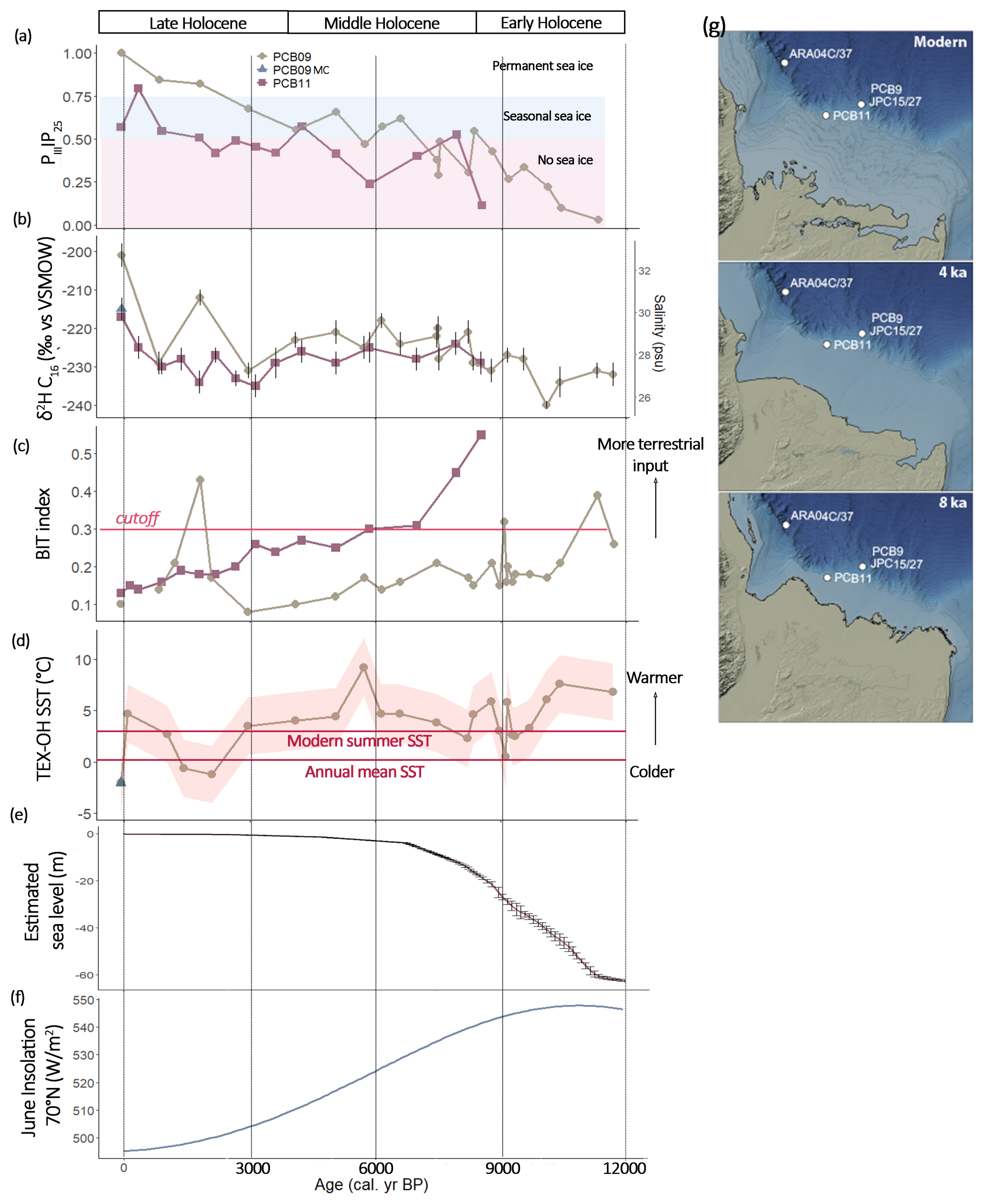 The Late glacial to Early Holocene is only recorded at the shelf slope location (PCB09, Fig. 1). This period is characterized by low concentrations of sea ice biomarkers (Fig. 3a, b) resulting in low PIP25 values (Fig. 4a). The low concentration suggests that this area had intermittent sea ice coverage during the Late glacial to Early Holocene, but the presence of HBI III and HBI IV (Fig. 3e, f) indicate that the region was only under seasonal ice cover until spring allowing late spring/summer open-water diatom primary production (Belt et al., 2015). Heterotrophic production in the shelf slope region during this period is relatively low (as suggested by the presence of ammonium oxidizer Thaumarchaea-derived isoGDGTs; Schouten et al., 2013; Fig. 3g, h) but increased and peaked at 8.2 ± 0.5 ka. During 12–8.2 ka, SSTs were elevated in comparison with the rest of the Holocene (Fig. 4d) which coincided with peak 21 June insolation (Fig. 4f) (Clemens et al., 2010; Laskar et al., 2004). The warmer surface waters might have inhibited the development of sea ice over the Beaufort Shelf.