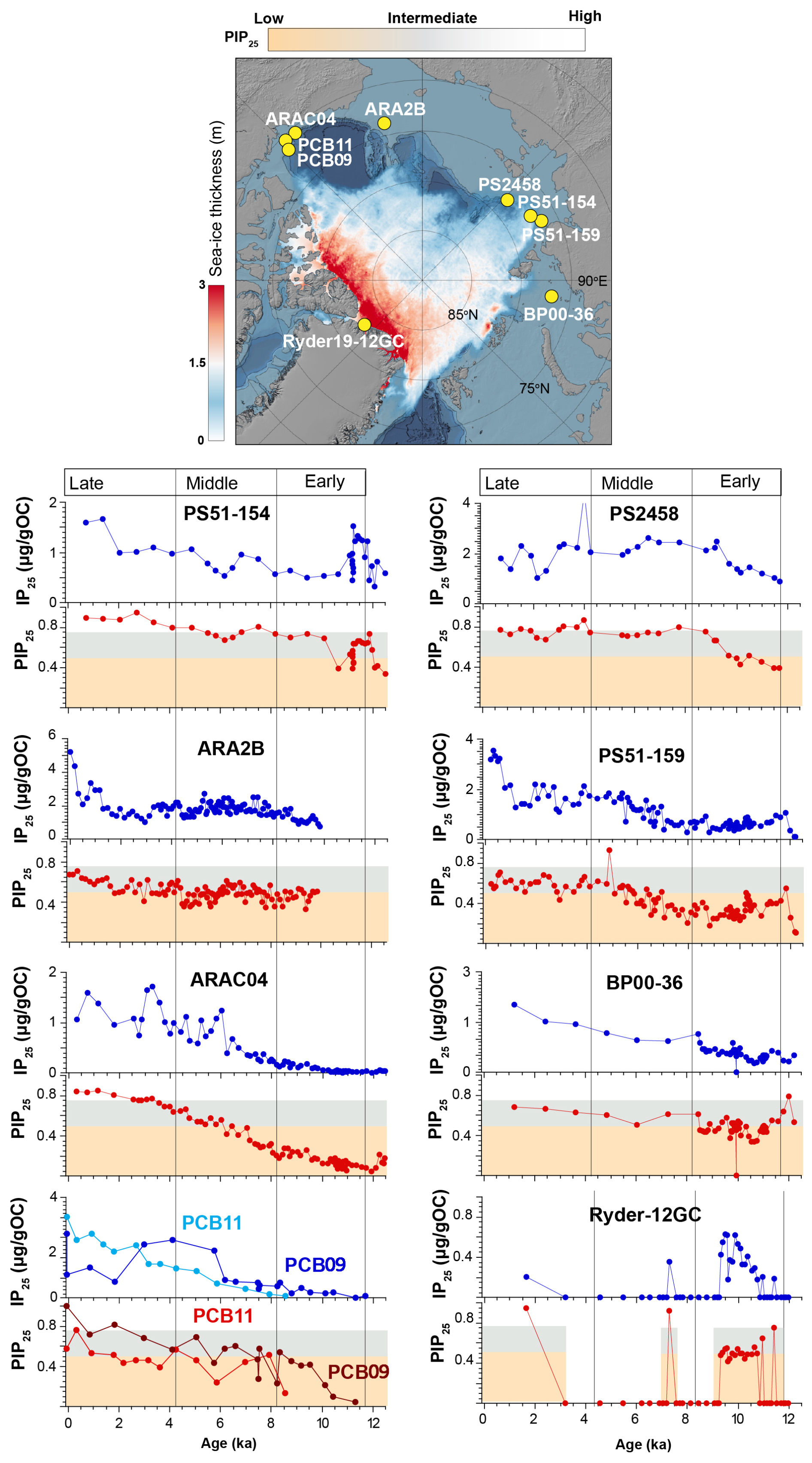 Previous studies using IP25 to reconstruct sea ice variability in Arctic marginal seas have reported largely open-water conditions with significant freshwater influence during the Late glacial to Early Holocene.