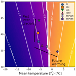For seasonal frost area (including permafrost), we found a negative but statistically not significant correlations with mean temperatures (northern hemisphere: ), but significant positive correlations with seasonal amplitude (northern hemisphere: r=0.88) (Fig. 5m). Similar correlations were found regionally (Fig. 5n–p). As visible from Fig. A1, higher seasonal amplitudes of the MH and LIG increase the seasonal frost probability outside the permafrost domain, while the higher mean temperatures of the LIG cause a reduction of pSF. These opposing effects are partly compensating each other in the original MH and LIG climates (Fig. A1e, i).