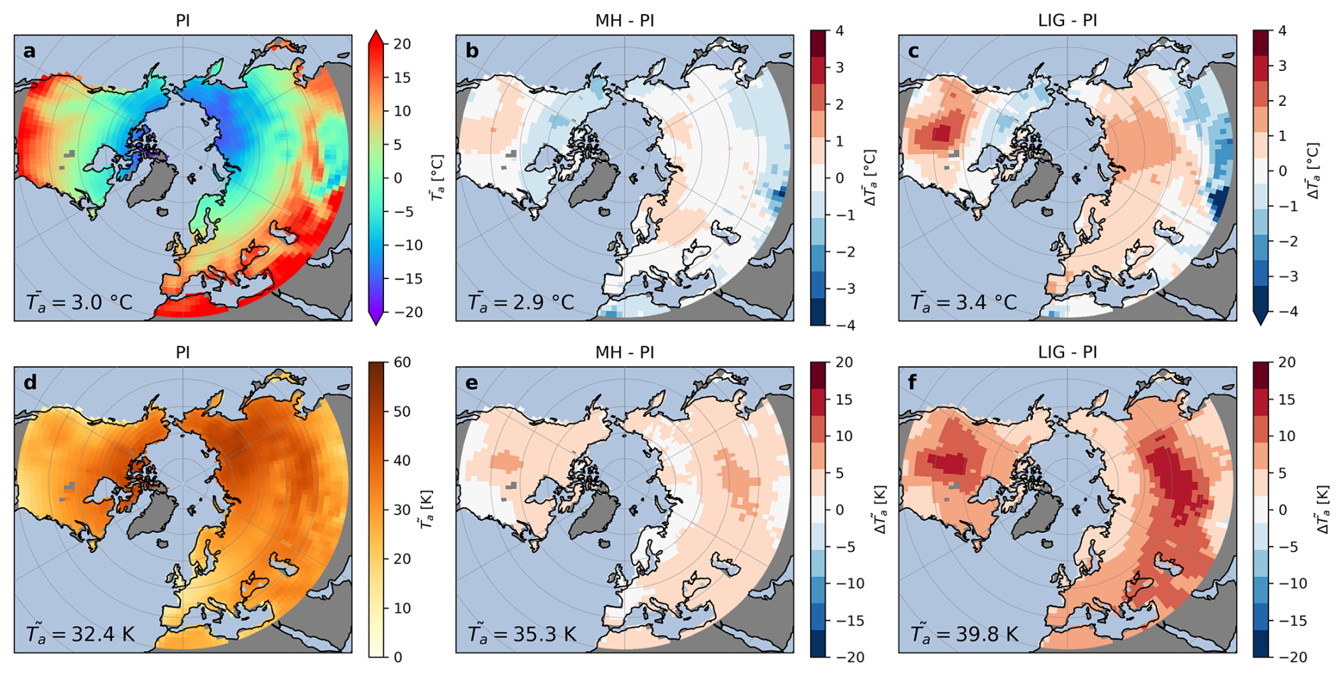 Figure 1Overview of the mean () and seasonal amplitude () of surface temperatures in the simulation domain simulated by AWI-ESM-2.5. Absolute values are shown for the pre-industrial (PI; (a), (d)), and anomalies (indicated as and ) relative to the PI are shown for the Mid Holocene (MH; (b), (e)) and the Last Interglaical (LIG; (c), (f)).