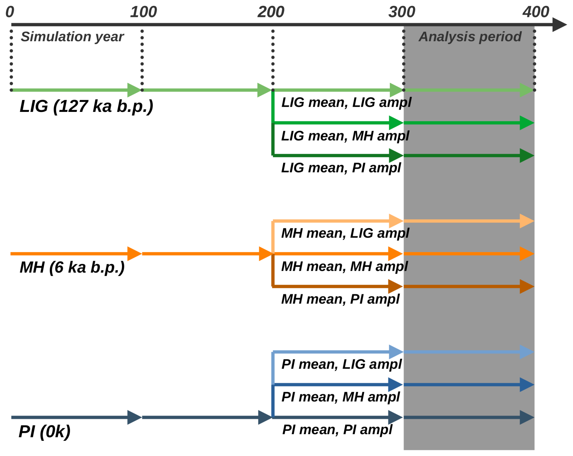 Figure 2Overview of the simulation protocol. After a 200-year spin-up of each original climate forcing (PI, MH, LIG), three experiments, in which the climate forcing had the same mean temperatures, but different seasonal amplitudes were branched off and continued for another 200 years. The final 100-year period was used for the analyses.