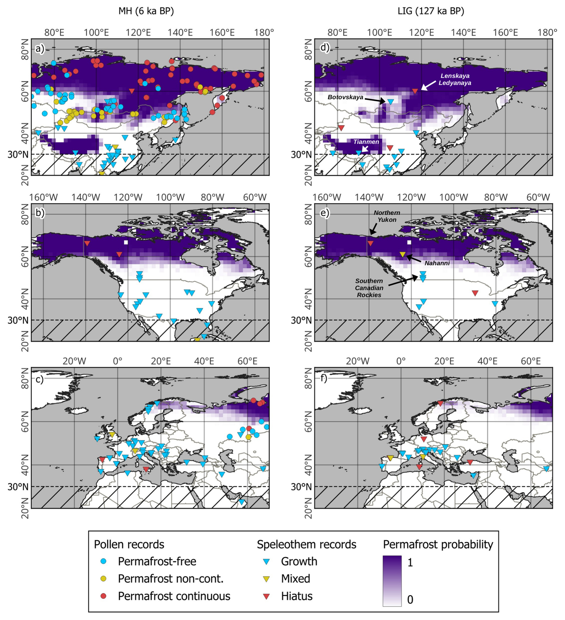 Figure 3Simulated permafrost probabilities for the MH (a, b, c) and LIG (d, e, f) together with permafrost proxies based on speleothem growth (diamond marker) and pollen records (circles). Speleothem growth indicates permafrost absence while hiatuses can be explained by permafrost presence. The mixed category represents locations with records of both speleothem growth and hiatuses during the respective period. Prominent cave systems in the permafrost regions of eastern Eurasia and North America are labelled in panels (d) and (e). The dotted line at 30° N represents the southern limit of the simulation domain. Note that the pollen records only cover northern Eurasia during the MH.