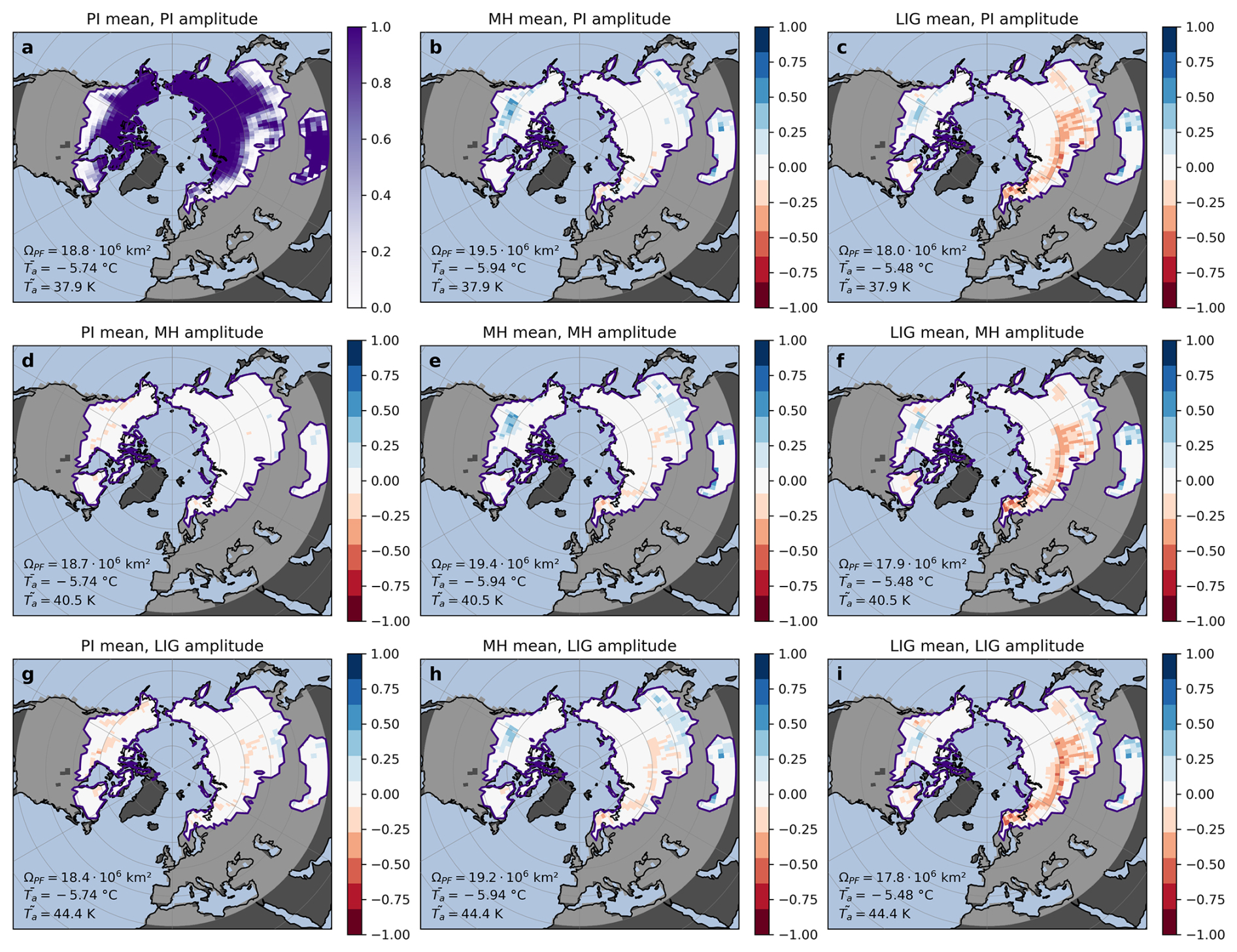 Figure 4Simulated permafrost probabilities (pPF) for all climate forcings, shown as absolute values for the pre-industrial (PI) experiment (a), and as anomalies relative to the PI for all other experiments (b–i). The results for the original climate forcings are shown on the on the diagonal (PI: (a); MH: (e); LIG: (i)), and the off-diagonal panels show results for the alternative climate forcings, with each column having the same mean temperature (PI: (a), (d), (g); MH: (b), (e), (h); LIG: (c), (f), (i)) and each row having the same seasonal temperature amplitudes (PI: (a), (b), (c); MH: (d), (e), (f); LIG: (g), (h), (i)). The purple line marks the limits of the joint permafrost domain of all simulations. The permafrost area (Ωpf), the mean annual temperature (), and the mean seasonal temperature amplitude () for the joint permafrost domain are given in the lower left corner of each panel.