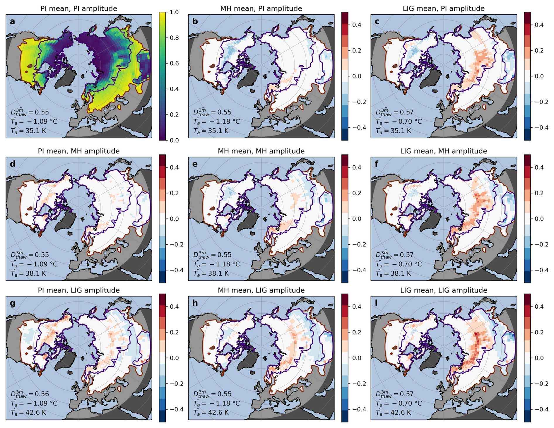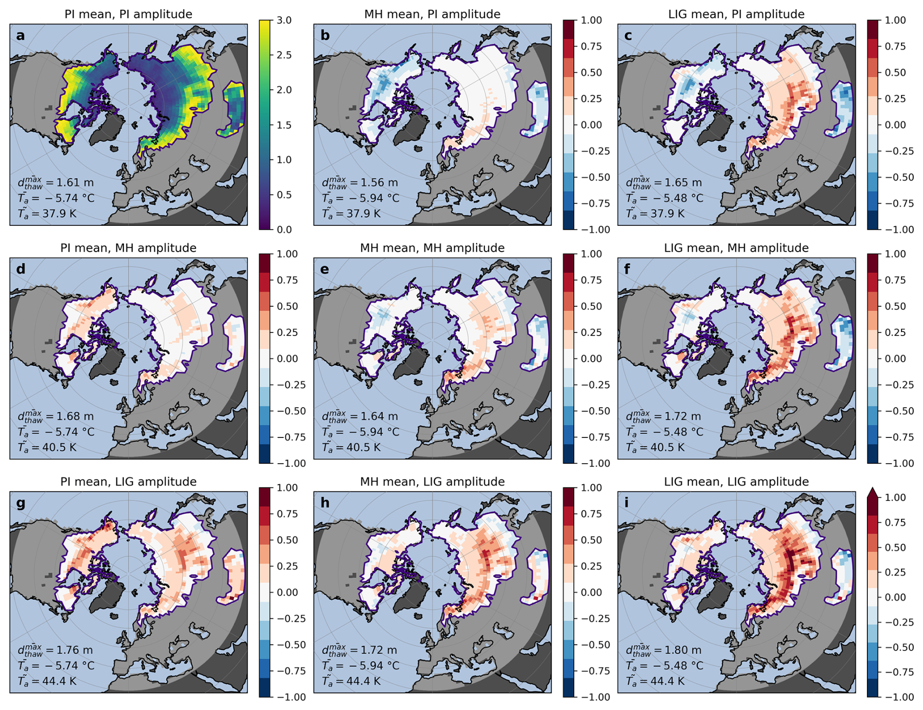 The results for the maximum annual thaw depth (i.e., the active layer thickness in permafrost areas) reveal more complex patterns and dependencies on mean temperatures and seasonal temperature amplitudes than those for the permafrost probabilities (Fig. 6). The average maximum thaw depth across the joint permafrost region was 1.61 m in the PI and thus lower than in the MH (1.64 m) and LIG (1.80 m).
