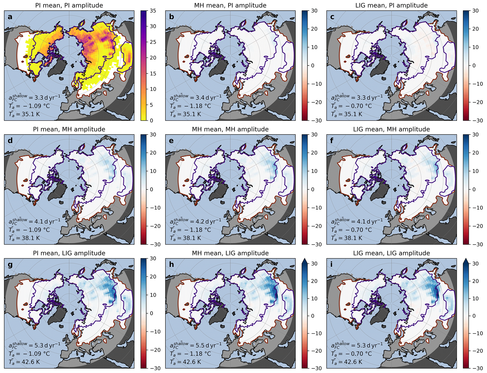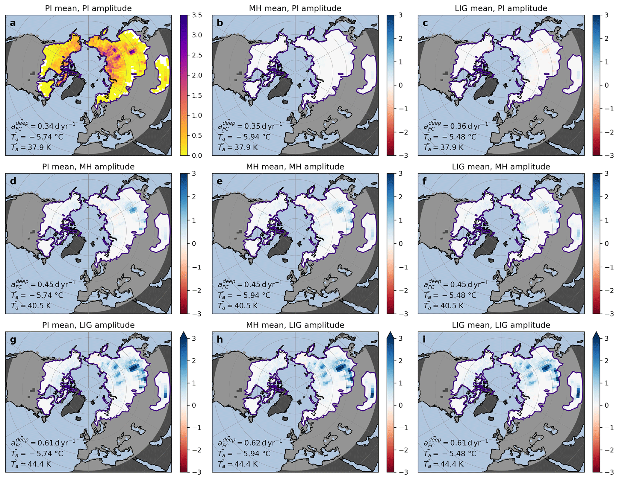 where , denotes the annual mean, the seasonal amplitude, and 〈⋅〉t denotes the temporal mean over the entire forcing time series. In doing so, the seasonal amplitudes of the original forcing were retained, while the mean temperatures were adjusted to those of the other climate states. The snowfall time series were left unchanged and therefore correspond to those of the climate characterizing the seasonal amplitude. In total, we obtained nine climate forcing time series corresponding to all combinations of the means and seasonal amplitudes of the PI, MH, and LIG surface temperatures.